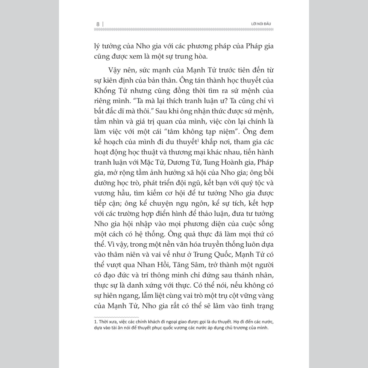 Mạnh Tử rất giỏi hùng biện, ông đã giảng một cách thấu đáo và sinh động về mệnh đề rộng lớn là “Tu thân, tề gia, trị quốc, bình thiên hạ”. Đồng thời ông cũng thể hiện được trải nghiệm sâu sắc và nhạy bén trong cách đối nhân xử thế tài tình của mình. Cho dù hiện tại, bạn đang tự mình kiên trì trên đường đời hay tạm thời lạc lối trước bước ngoặt của số phận, bạn sẽ có được phương hướng và dũng khí để tiếp tục tiến về phía trước thông qua cuốn sách này.