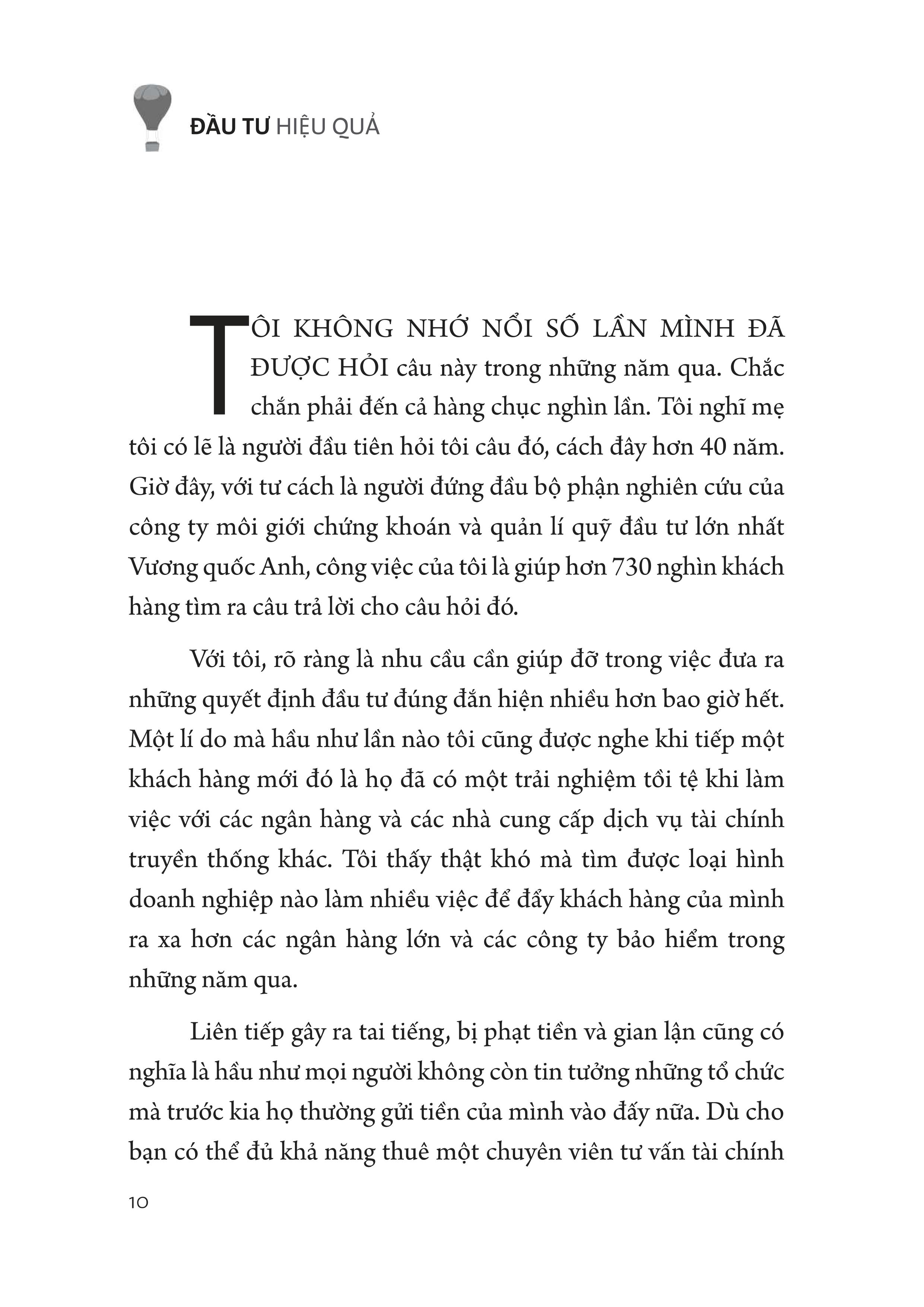 Mark Dampier đã giúp hàng nghìn nhà đầu tư trả lời câu hỏi này qua cuốn sách đầu tiên của mình “Đầu tư hiệu quả”. Như Mark giải thích, đầu tư thành công không hề phức tạp hay tồn thời gian. Với cuốn sách này, bạn có thể tìm được những cách kiếm tiền hiệu quả phù hợp với bản thân, không quan trọng là bạn bắt đầu với bao nhiêu tiền.