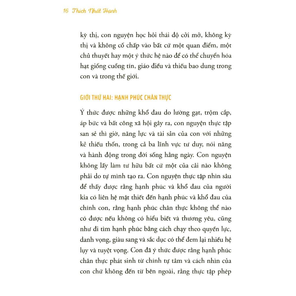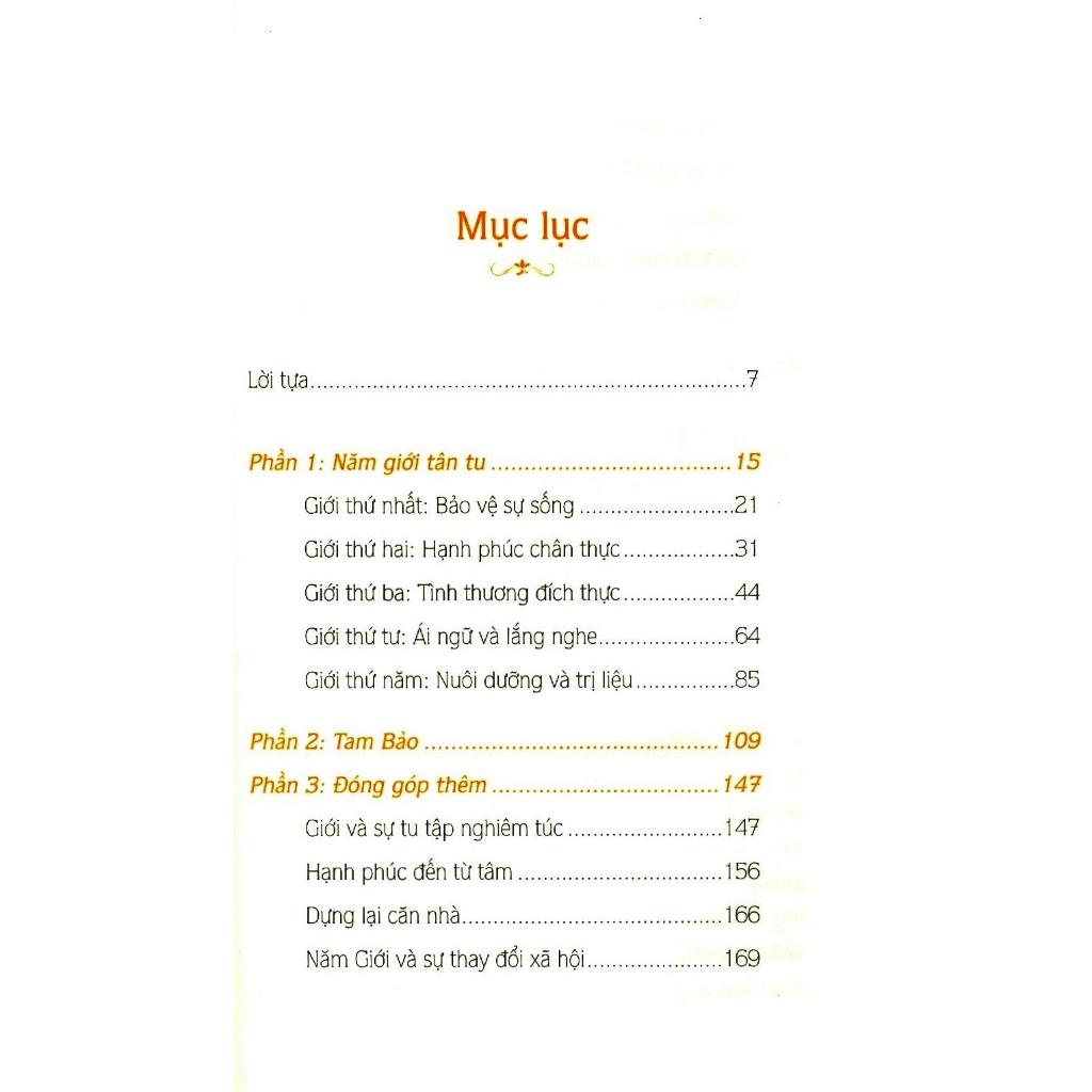 Học hỏi và thực tập theo Năm Giới và nương tựa Tam Bảo chắc chắn sẽ mang lại an lạc cho bản thân, cho cộng đồng và cho xã hội. Là con người, chúng ta cần có một cái gì để tin tưởng, một cái gì lành, đẹp và thật, một cái gì mà ta có thể tiếp xúc. Trong quyển sách này, Năm Giới được diễn bày theo hình thức mới, đó là Bảo vệ sự sống, Hạnh phúc chân thực, Tình thương đích thực, Ái ngữ và Lắng nghe, Nuôi dưỡng và trị liệu.