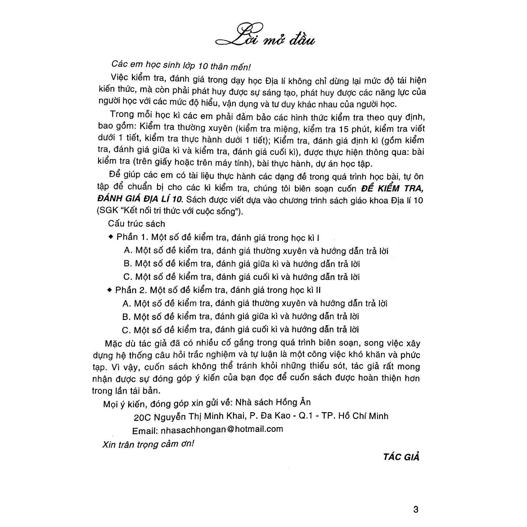 Để giúp các em có tài liệu thực hành các dạng đề trong quá trình học bài, tự ôn tập để chuẩn bị cho các kì kiểm tra, chúng tôi biên soạn cuốn ĐỀ KIỂM TRA, ĐÁNH GIÁ ĐỊA LÍ 10. Sách được viết dựa vào chương trình sách giáo khoa Địa lí 10 (SGK “Kết nối tri thức với cuộc sống”).