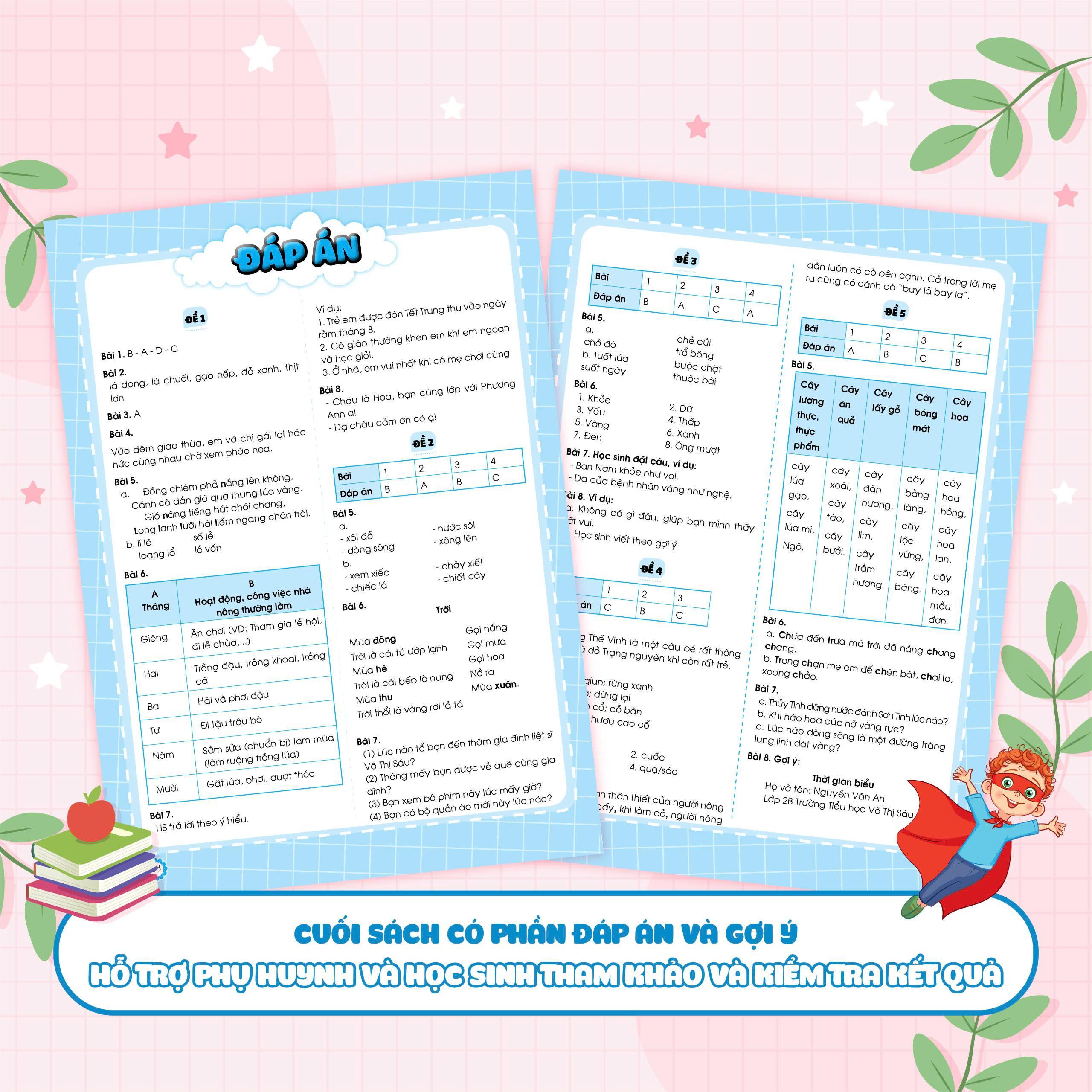 - Đề kiểm tra: Mỗi cuốn sách cung cấp 5 đề kiểm tra cuối học kì để kiểm tra, đánh giá kiến thức tổng hợp của học sinh. Mỗi đề kiểm tra gồm 2 phần trắc nghiệm và tự luận với thang điểm cụ thể, giúp các em luyện tập và củng cố lại kiến thức, tự tin chinh phục các bài kiểm tra giữa kì và cuối kì.