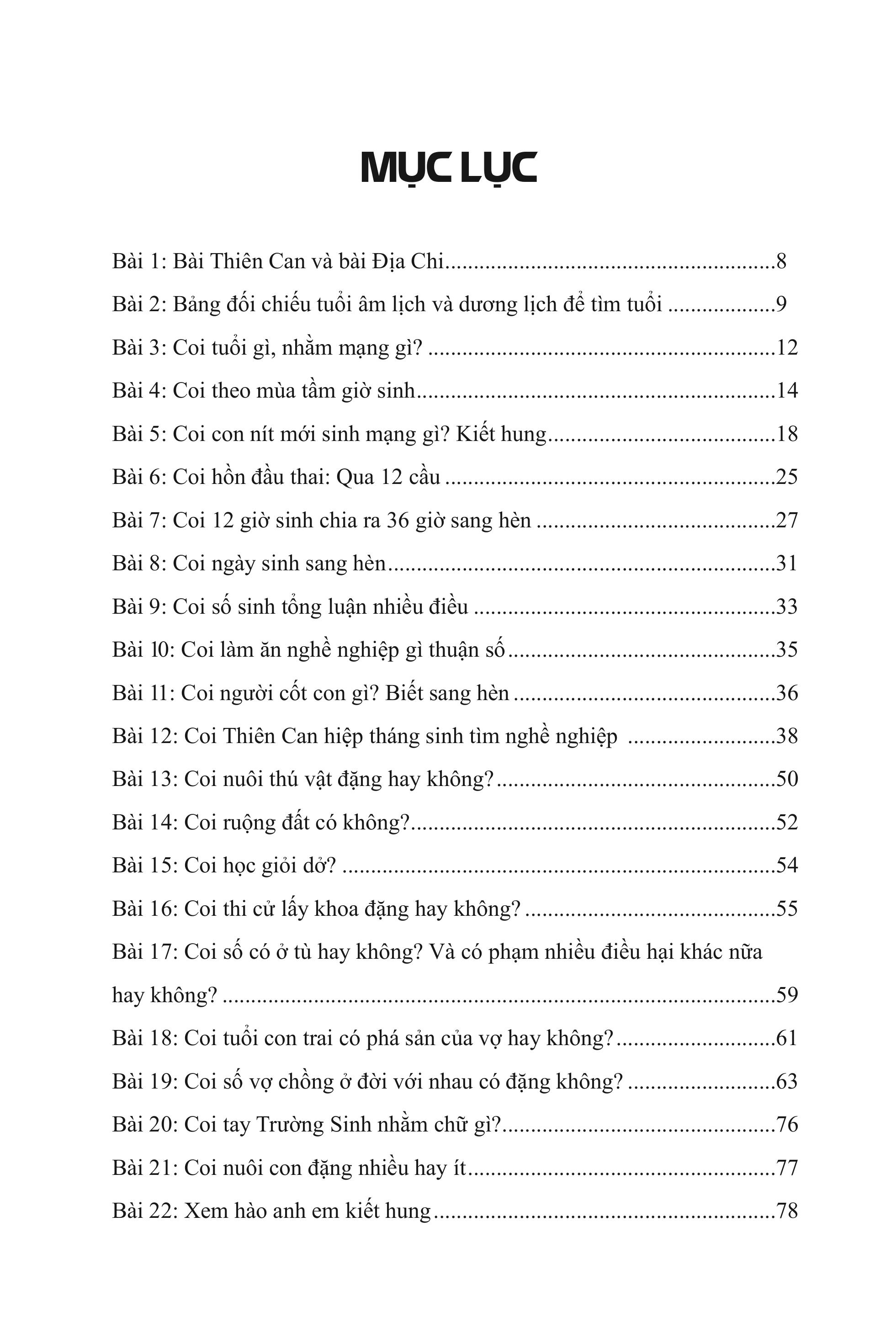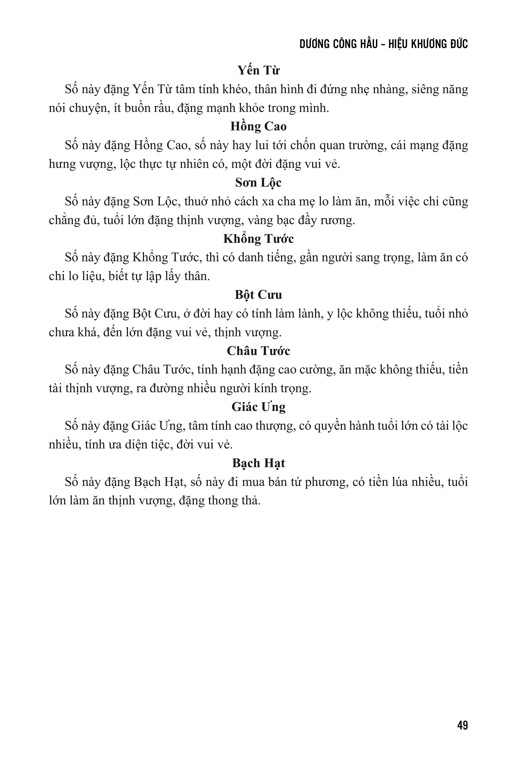 Ngoài ra, cuốn sách sẽ cho biết tiền kiếp của bạn ra sao, tác động đến vận mệnh hiện tại tương ứng thế nào. Ví dụ như: Trước có tu hành và có cứu người, cho nên kiếp này đặng lộc thực đầy đủ, của tiền nhiều, có điền viên rộng, có chức phận sang trọng, đặng sống lâu, đi xứ khá hơn.
