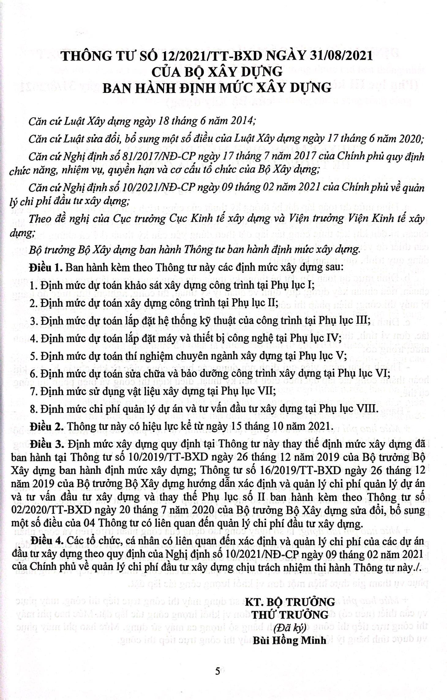 Ngày 30/08/2024 Bộ Xây dựng đã ban hành Thông tư 09/2024/TT-BXD Sửa đổi, bổ sung một số định mức xây dựng ban hành tại Thông tư số 12/2021/TT-BXD ngày 31/08/2021 của Bộ trưởng Bộ Xây dựng. Thông tư bao gồm 5 phụ lục: