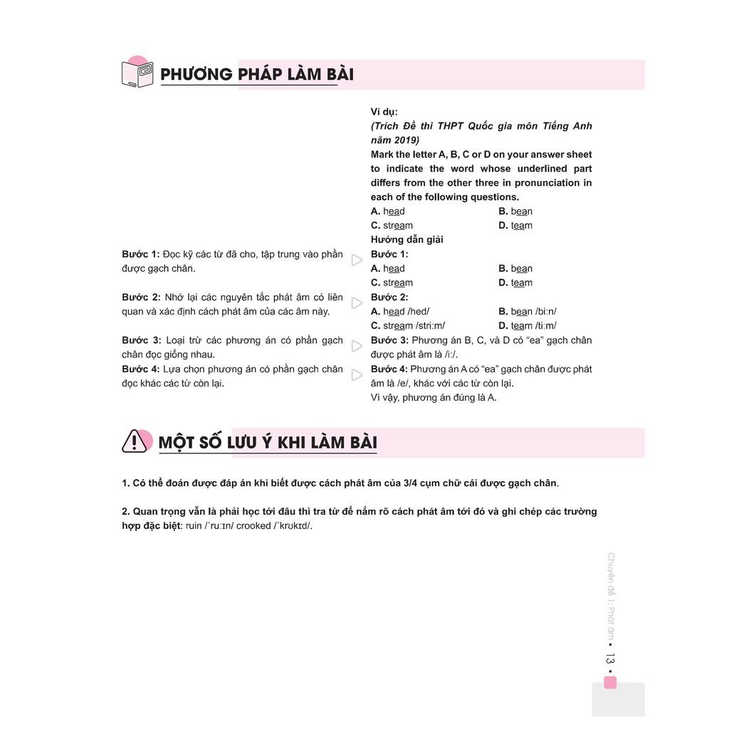 – Phạm vi kiến thức: Bao gồm đầy đủ kiến thức và kĩ năng tiếng Anh lớp 10, 11 và 12, bám sát các dạng bài thường xuất hiện trong đề thi THPT Quốc gia hằng năm, được chia thành các nội dung Ngữ âm, Từ vựng, Ngữ pháp như sau: