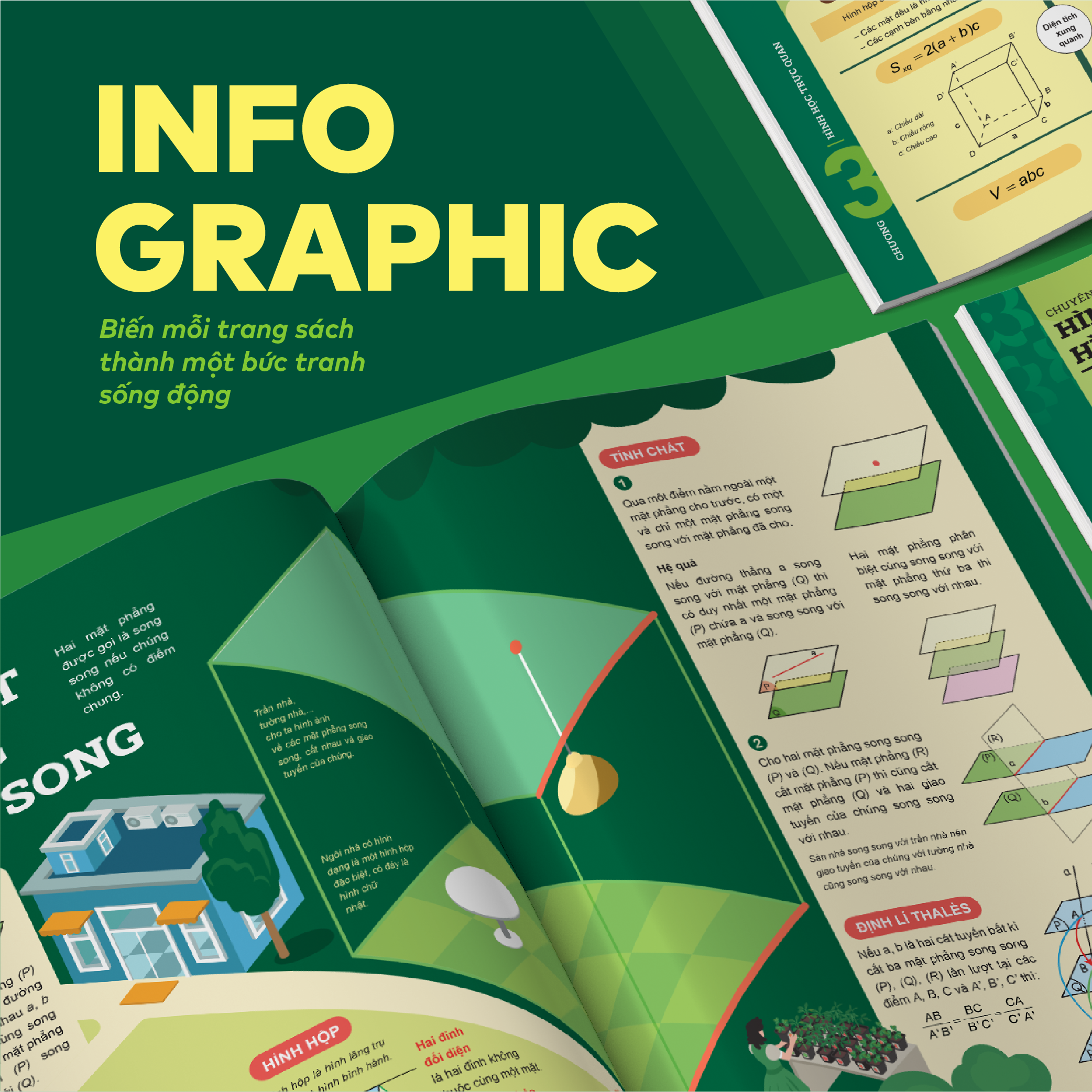 Mỗi phần lí thuyết khô khan trở nên dễ hiểu và thú vị hơn nhờ các infographic sinh động. Bạn sẽ cảm nhận được sự khác biệt ngay từ lần đầu mở sách, khi kiến thức hiện ra một cách trực quan, dễ nhớ và đầy màu sắc.