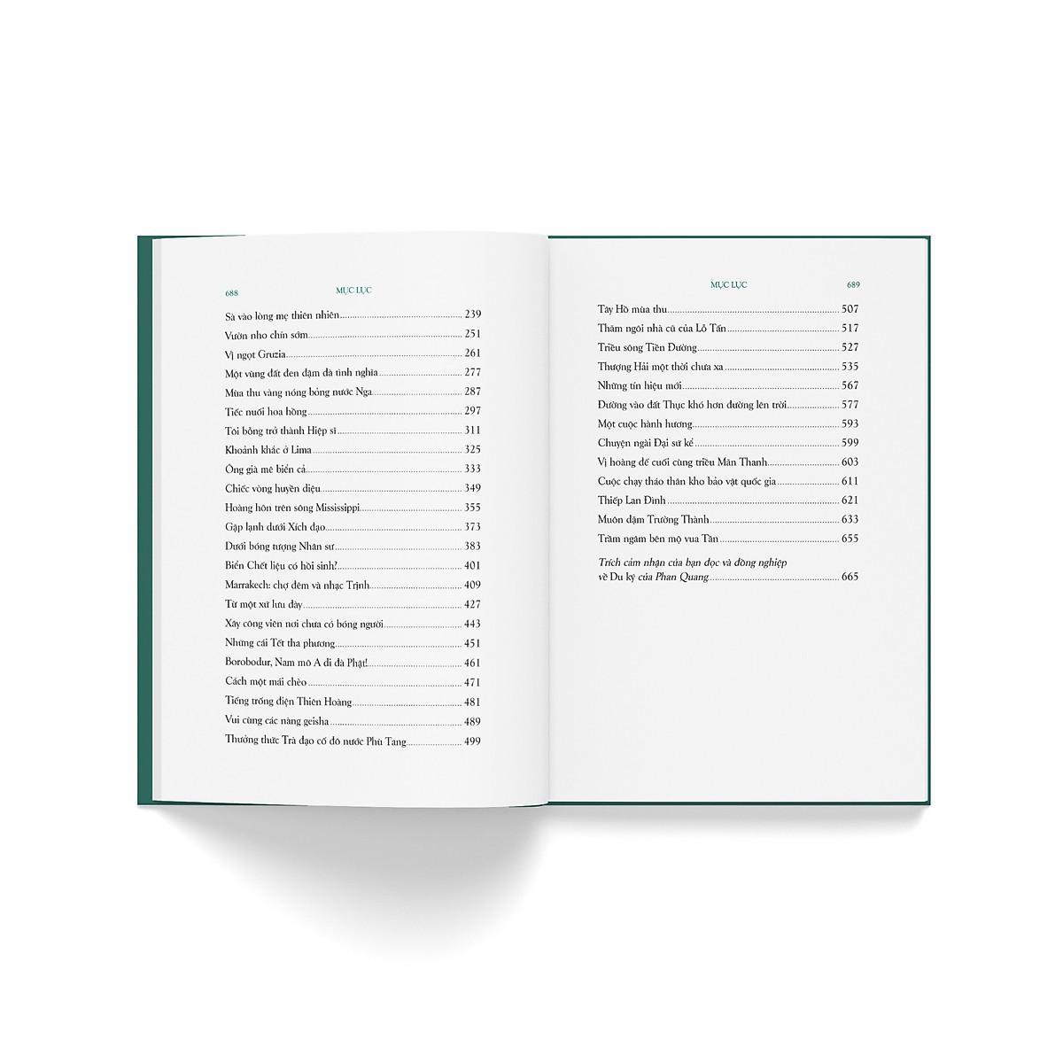 Tuyển tập sẽ đưa bạn đọc đi qua các nước và châu lục theo trình tự: từ Pháp, Bỉ, châu Âu, châu Mỹ, châu Phi, châu Úc, châu Á và kết thúc ở Trung Quốc. Khép lại tuyển tập là phần Phụ lục chọn trích cảm nhận của một số độc giả vềDu kýcủa Phan Quang, đã đăng báo, in sách, có ghi rõ xuất xứ và thời điểm, cùng hai bài thơ do hai người bạn vong niên của tác giả sáng tác nhân dịp mừng tác giả đạt tuổi 90.