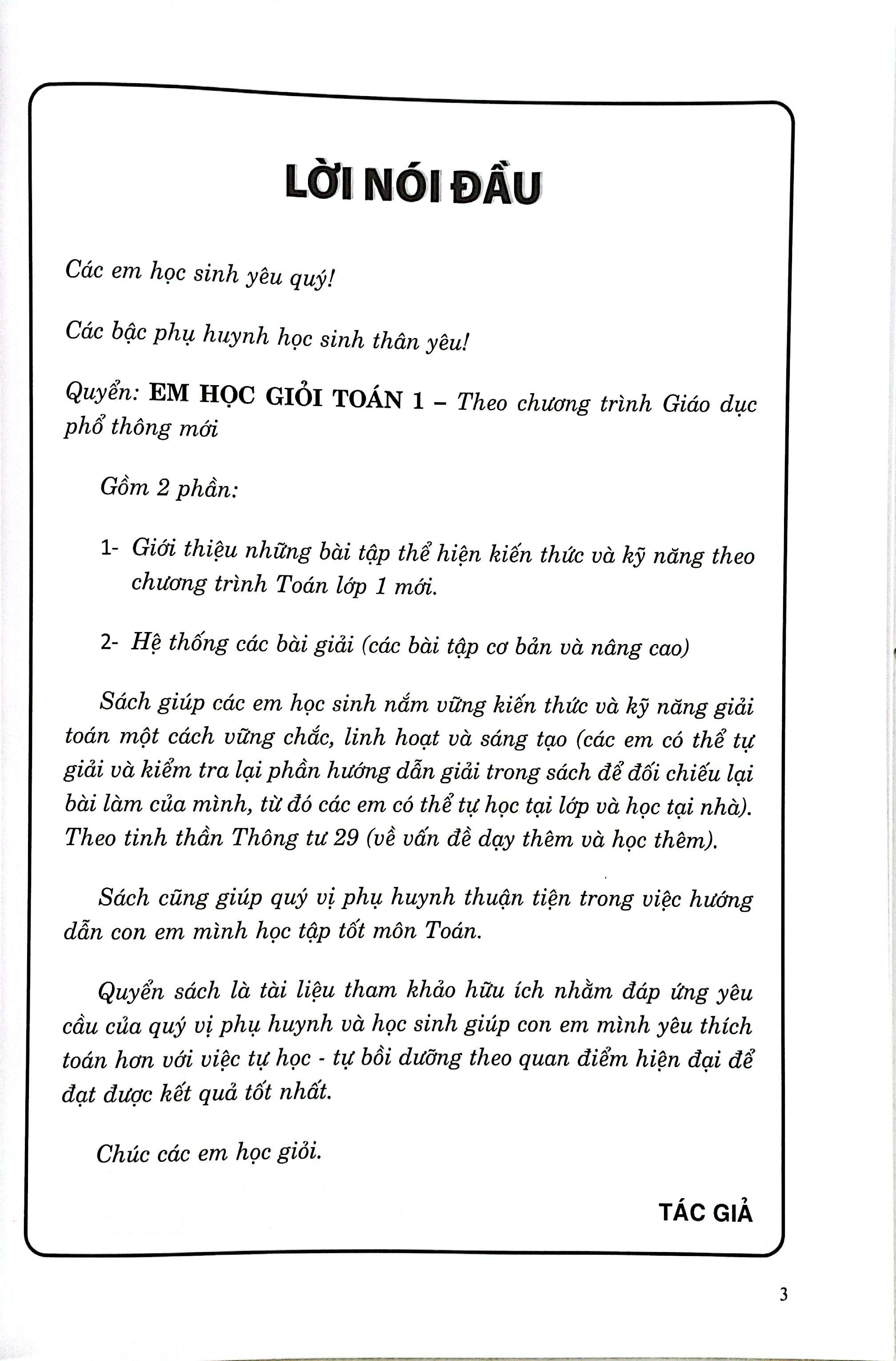 Em Học Giỏi Toán 1 ( Dùng Chung Các Bộ SGK ) Nhằm giúp quý thầy, cô, phụ huynh và các em học sinh có thêm tư liệu hướng dẫn con em và để các em học sinh học tốt môn Toán lớp 1 theo chương trình giáo dục phổ thông mới, tác giả biên soạn quyển sách: Giúp Em Giỏi Toán Lớp 1 Nội dung sách được biên soạn không ngoài mục đích cùng quý thầy, cô và phụ huynh giúp các em học sinh lớp 1 rèn luyện khả năng phán đoán, suy luận, từ đó giúp các em phát triển năng lực học và yêu thích môn Toán hơn.