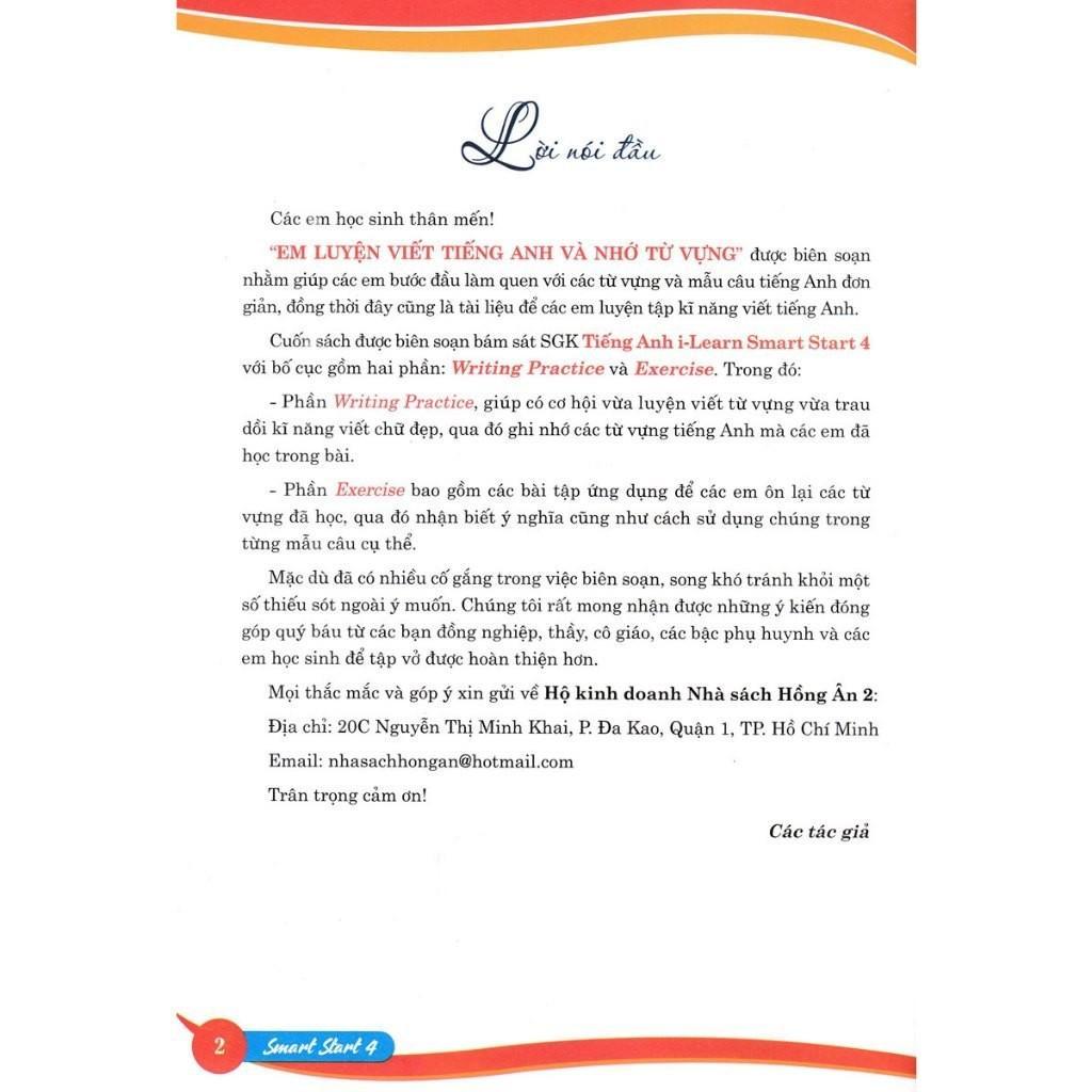 Cuốn sách được biên soạn bám sát SGK Tiếng Anh i-Learn Smart Start 4 với bố cục gồm hai phần: Writing Practice và Exercise. Trong đó:
