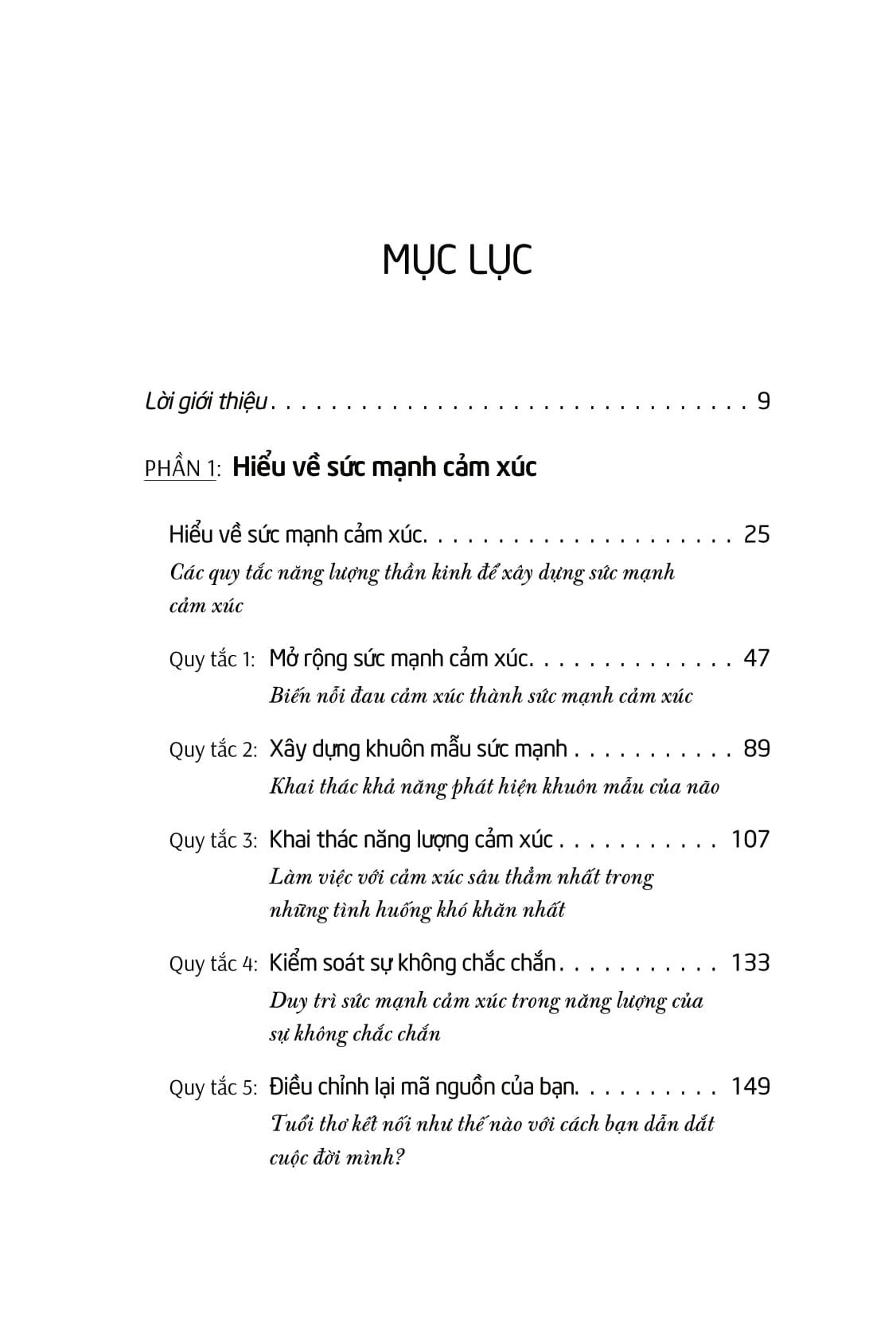 Cuốn sách bao gồm 8 quy tắc, được thiết kế như một giúp bạn khai thác tiềm năng của bộ não và tạo ra những thay đổi sâu sắc trong cuộc sống của chính m.ình lẫn những người xung quanh. Điều làm Năng lượng cảm xúc trở nên khác biệt chính là: những phương pháp “lạ lùng” và khác thường nhưng lại vô cùng hiệu quả, những câu hỏi xoáy sâu để ta tự khám phá tường tận những ngóc ngách của cảm xúc và cả những phân tích vừa khoa học vừa nhân văn khiến ta không ngừng gật gù cảm thán.