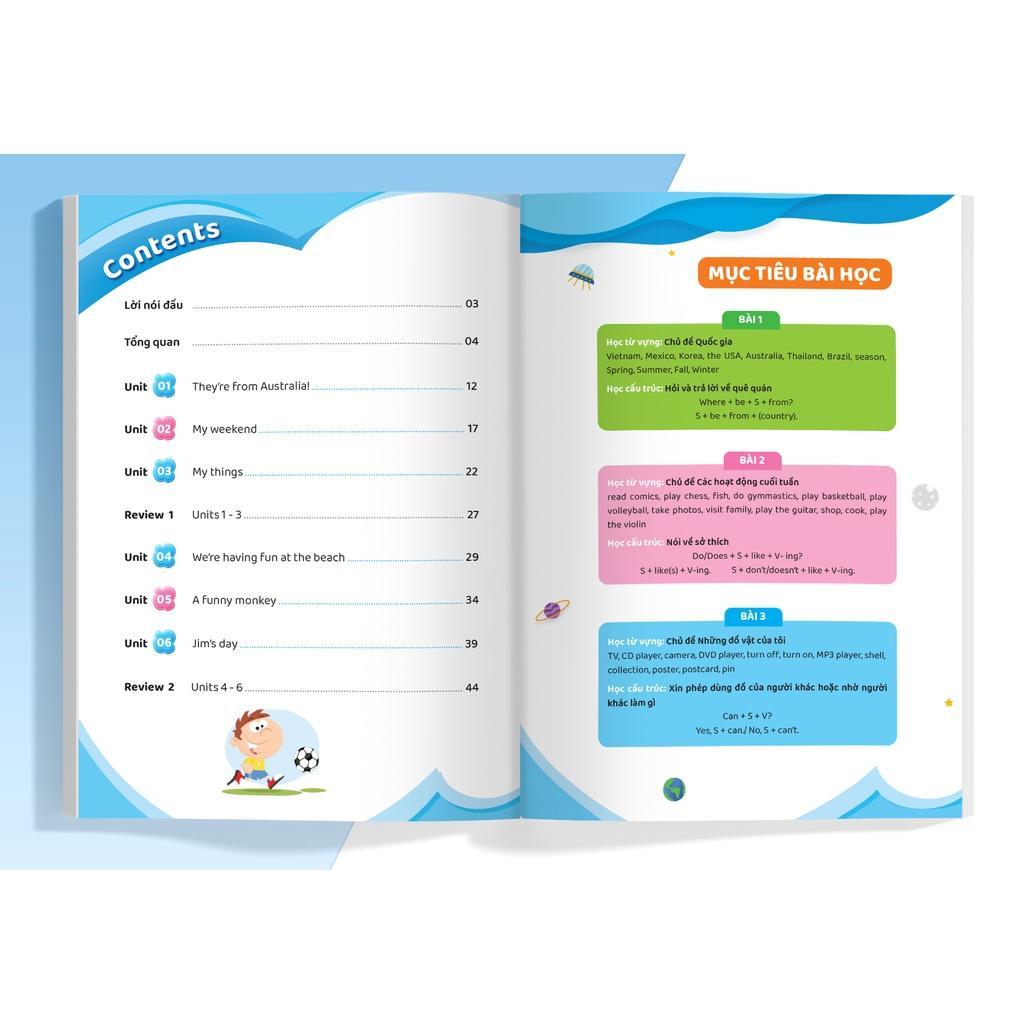 Các em được học từ vựng theo chủ đề qua hình ảnh sinh động, làm quen ngữ pháp qua bài đọc và các cấu trúc câu.