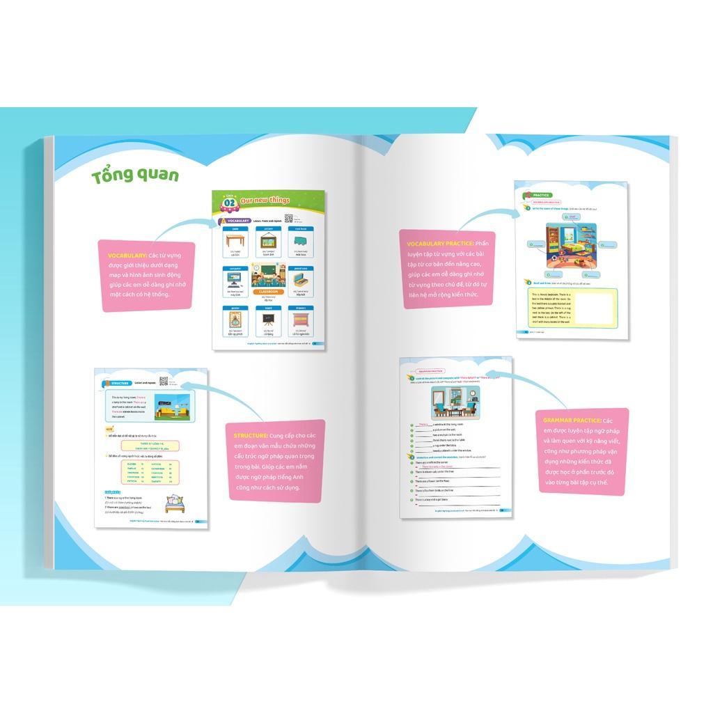 • Các phần lý thuyết và bài tập vận dụng đưa các em tiếp cận đầy đủ các kỹ năng: nghe, nói, đọc, viết, từ đó tạo dựng nền tảng tiếng Anh vững chắc.
