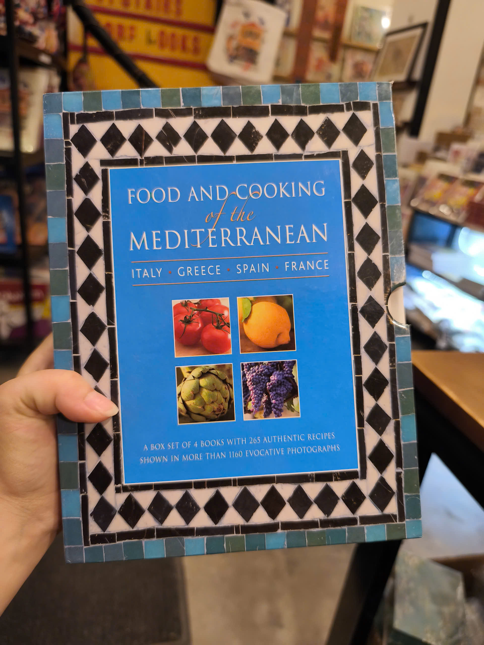 Đây là bộ hộp gồm 4 cuốn sách bìa cứng 96 trang với 265 công thức nấu ăn đích thực được thể hiện trong hơn 1160 bức ảnh gợi cảm. Đây là bộ sưu tập 265 món ăn Địa Trung Hải vượt thời gian, từ súp và salad đơn giản đến các món thịt, cá và rau ngon tuyệt, cùng các loại bánh ngọt, bánh nướng và món tráng miệng. Sách giới thiệu các món ăn đơn giản, đậm đà và thơm ngon từ Ý, Hy Lạp, Tây Ban Nha và Pháp, sử dụng những sản phẩm theo mùa tốt nhất. Sách bao gồm các công thức nấu ăn cổ điển ngập tràn ánh nắng từ mỗi vùng, chẳng hạn như Pizza Sicilia, Taramasalata Hy Lạp, Paella Tây Ban Nha và Cassoulet Toulouse. Sách được minh họa đẹp mắt với hơn 1160 bức ảnh xa hoa, bao gồm hướng dẫn từng bước dễ làm theo và hình ảnh tuyệt đẹp về từng món ăn đã hoàn thành. Bốn cuốn sách này tập hợp một tuyển tập tuyệt vời các công thức nấu ăn đích thực từ Ý, Hy Lạp, Tây Ban Nha và Pháp, bao gồm món khai vị, món chính, salad, bánh mì, đồ ngọt và món tráng miệng. Tất cả các món ăn truyền thống kinh điển đều được bao gồm - chẳng hạn như Tagliatelle alla Bolognese, Loukoumia, Crema Catalana và Moules Marinieres - cũng như hướng dẫn đầy đủ về cách nhận biết, chế biến, sử dụng và nấu ăn với các nguyên liệu truyền thống Địa Trung Hải. Được minh họa bằng hơn 1160 bức ảnh tuyệt đẹp, bộ hộp thiết yếu này là một bộ sưu tập công thức nấu ăn ngon tuyệt, đa dạng như chính con người và vùng miền nơi chúng xuất xứ, và sẽ mang đến hương vị đích thực của Địa Trung Hải.