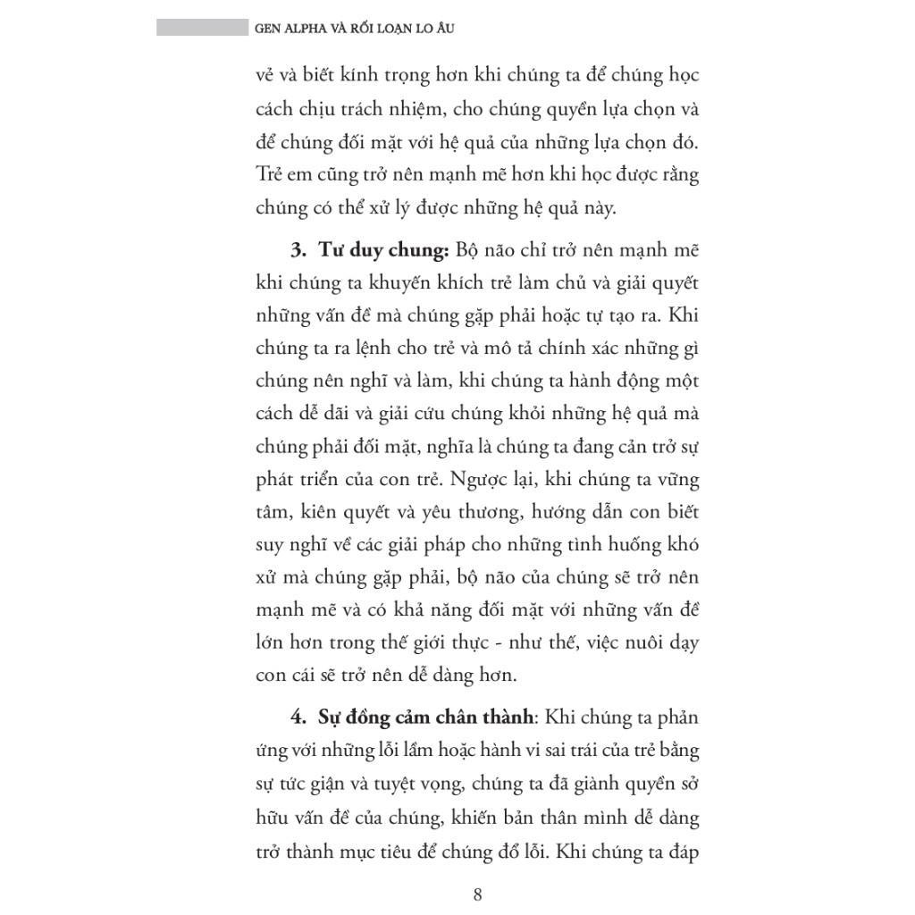• Phần 2: Cung cấp các công cụ thực hành, tình huống điển hình và phương pháp xử lý các thách thức phổ biến trong quá trình trưởng thành: bị bắt nạt, áp lực bạn bè, sử dụng công nghệ quá mức, mâu thuẫn trong gia đình, lo âu xã hội, hay các khó khăn trong giai đoạn dậy thì và hình thành nhân cách. Các hướng dẫn đều được thiết kế dựa trên nguyên tắc tôn trọng – yêu thương – thiết lập giới hạn – trao quyền kiểm soát phù hợp cho trẻ. Điểm mạnh nổi bật của cuốn sách là tính ứng dụng cao, ngôn ngữ dễ hiểu, giàu ví dụ thực tiễn, có lồng ghép các bài tập rèn luyện tư duy và cảm xúc, phù hợp với bối cảnh giáo dục và văn hóa gia đình hiện đại.