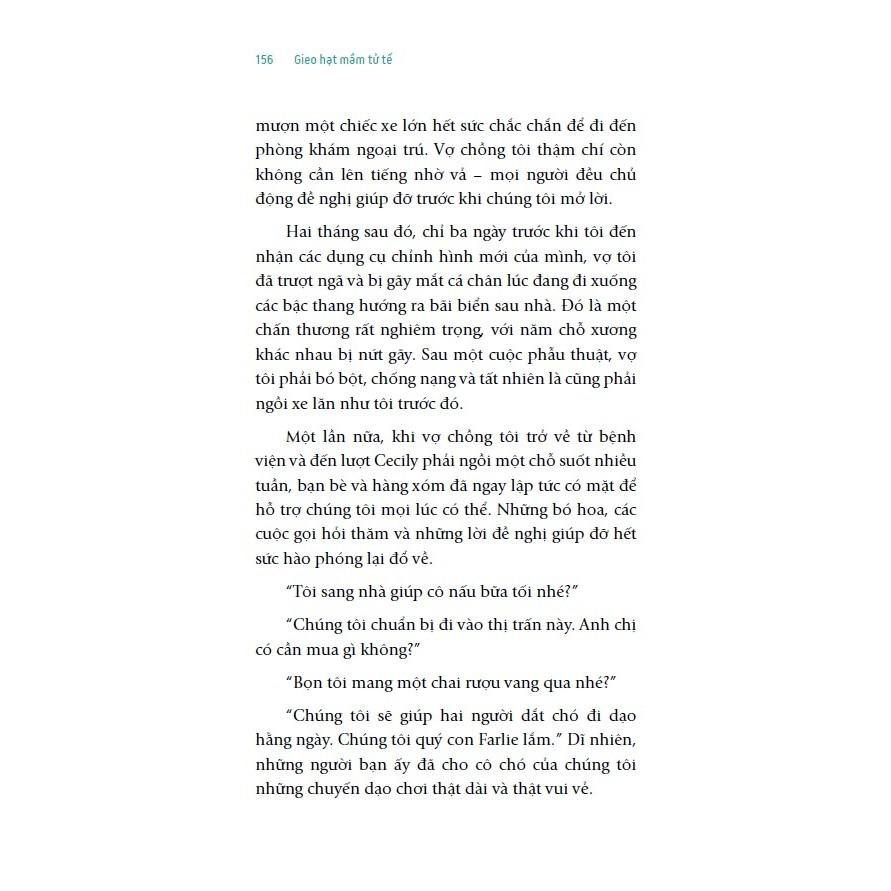 - Suy nghĩ tử tế, thái độ tử tế, hành động tử tế để hạnh phúc trọn vẹn - Bạn có nghĩ một hành động nhỏ của mình có thể thay đổi cuộc đời của một người nào đó không, hoặc… ngược lại? Ở thời đại mà những tin tức xã hội tiêu cực tràn ngập mặt báo, các chủ đề về bạo lực, chiến tranh hay tiêu đề giật gân về đời sống riêng tư của người nổi tiếng lại là từ khóa được nhiều người tìm kiếm, thật khó để tin rằng thế giới này vẫn còn tồn tại tình yêu thương, sự tử tế hay những hành động giúp đỡ vô điều kiện giữa người với người. Dù vậy, tử tế vẫn là một trong những điều tốt đẹp nhất mà chúng ta có thể trao cho nhau. Sự tử tế không nhất thiết phải là những việc quá lớn lao, mà chúng có thể bắt nguồn từ những hạt mầm bé nhỏ được ta “gieo trồng” mỗi ngày. Đó có thể chỉ là những hành động đơn giản và ngẫu nhiên, nhưng theo thời gian, với “sự chăm bón” đúng cách, chúng có thể tạo nên những thay đổi lớn lao không chỉ cho mỗi cá nhân mà còn cho cộng đồng và thế giới. Đây cũng chính là thông điệp nhân văn mà quyển sách “Gieo Hạt Mầm Tử Tế” mang đến cho độc giả. Quyển sách gồm 27 câu chuyện đời thường đầy gần gũi và cảm động nói về lòng tốt và sự tử tế trong cuộc sống. Với văn phong giản dị nhưng không kém phần sâu sắc, “Gieo Hạt Mầm Tử Tế” khiến bạn cảm nhận được tình yêu thương vẫn luôn tồn tại dù cuộc đời này có khắc nghiệt đến đâu đi nữa. Và bạn sẽ nhận ra rằng khi bạn dịu dàng với thế giới này, bạn cũng sẽ nhận lại sự dịu dàng từ thế giới. Nối tiếp chủ đề ý nghĩa về sự tử tế của Bộ sách Hạt Giống Tâm Hồn, “Gieo Hạt Mầm Tử Tế” không mang đến những câu chuyện truyền cảm hứng về cuộc đời của một vĩ nhân hay một người nổi tiếng nào, mà quyển sách chứa đựng những câu chuyện bình dị mà ta dễ dàng bắt gặp trong cuộc sống hằng ngày. Đó có thể là câu chuyện của cậu bé Arthur cực kỳ thông minh nhưng mắc chứng tự kỷ sẵn sàng nhường đĩa bánh tiramisu yêu thích cho một người ăn xin bên đường. Hay câu chuyện về bác tài xế Mike tốt bụng cho hai cô sinh viên bị hỏng xe đi nhờ một đoạn đường giữa đêm bão tuyết, nhờ vậy mà vô tình cứu hai cô gái thoát khỏi vụ tai nạn kinh hoàng chỉ vài phút sau đó. Và còn nhiều câu chuyện nhân văn giàu ý nghĩa khác sẽ chạm đến trái tim bạn. Những cung bậc cảm xúc len lỏi trên từng trang sách sẽ giúp bạn nhận ra cuộc sống vốn muôn màu muôn vẻ. Mỗi người mà ta gặp trên đường đời này không ai là ngẫu nhiên và những hành động tử tế của bạn dành cho họ không điều gì là vô ích. Cũng trong quyển sách này, bạn sẽ bắt gặp được hình ảnh của chính mình, của những người xung quanh, hoặc đứng ở vị trí “người ngoài cuộc” để chiêm nghiệm, khám phá những điều thật sự ý nghĩa và tìm ra châm ngôn sống cho chính mình. Khép lại quyển sách “Gieo Hạt Mầm Tử Tế”, hy vọng bạn sẽ có thêm động lực để yêu thương bản thân và những người xung quanh bằng cách giúp đỡ mọi người, ngay cả khi đó là một hành động nhỏ. Hy vọng những hạt mầm tử tế từ những việc nhỏ này sẽ được gieo trong tâm hồn bạn, để từ đó được bạn vun trồng, tưới mát rồi có một ngày bạn sẽ nhận được quả ngọt mà hạt mầm nhỏ ấy mang lại. Về tác giả Amy Newmark là tác giả sách bán chạy, Tổng biên tập của bộ sách “Chicken Soup for the Soul”. Kể từ năm 2008, bà đã xuất bản 190 tựa sách mới cho “Chicken Soup for the Soul”, hầu hết đều bán chạy tại Hoa Kỳ và Canada. Amy Newmark được ghi nhận là người làm hồi sinh “Chicken Soup for the Soul” - thương hiệu nổi tiếng khắp thế giới, ra mắt lần đầu tiên vào năm 1993. Để làm được điều này, Amy đã tuyển chọn và biên soạn những câu chuyện có thật đầy cảm hứng - từ những con người bình thường có trải nghiệm phi thường. Qua đó, Amy giúp thương hiệu lâu đời “Chicken Soup for the Soul” luôn giữ được tính mới mẻ và phù hợp với độc giả ngày nay. Về tủ sách Hạt Giống Tâm Hồn: Năm 2002, First News cho ra mắt cuốn sách đầu tiên trong tủ sách “Hạt Giống Tâm Hồn”. Tủ sách được phát triển từ triết lý gieo hạt giống niềm tin, lòng can đảm, đức độ, khát vọng và tình yêu cuộc sống. Liên tục trong hơn 20 năm qua, Hạt Giống Tâm Hồn đã ra mắt bạn đọc với trên 300 tựa sách, tập hợp những câu chuyện ý nghĩa, cảm động về tình yêu thương vô bờ bến, nghị lực vươn lên trong cuộc sống, đức hy sinh cao cả. Những câu chuyện gần gũi, cảm động và giàu tính nhân văn trong tủ sách là nguồn động viên tinh thần cho hàng triệu độc giả, giúp họ vượt qua những khó khăn, thử thách, theo đuổi ước mơ và vươn tới một cuộc sống tốt đẹp hơn. Tủ sách Hạt Giống Tâm Hồn luôn đứng đầu các bảng xếp hạng sách được bạn đọc y