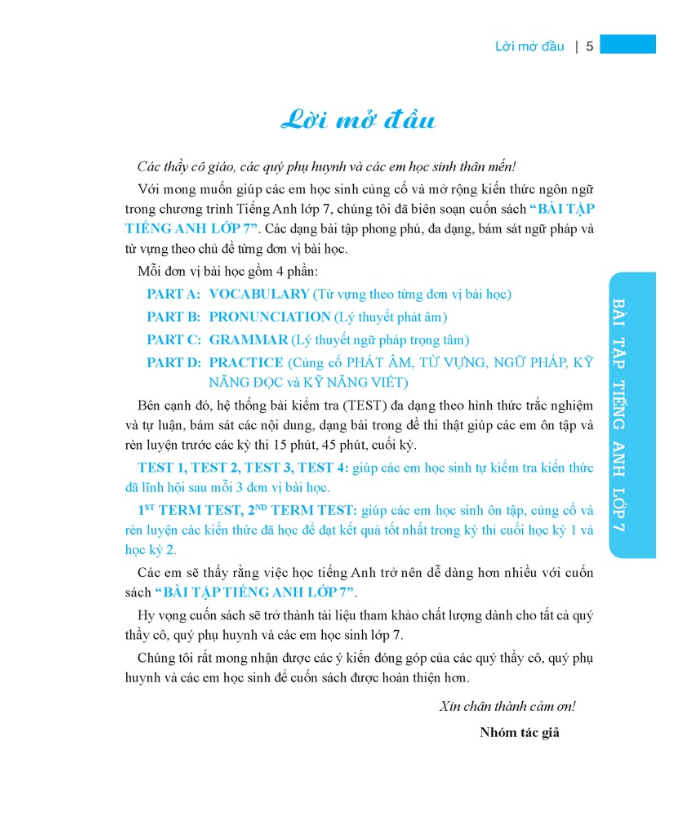 Sách bài tập tiếng anh lớp 7 được biên soạn dành cho học sinh lớp 7, do Nhà xuất bản Đại học Quốc gia Hà Nội phát hành. Dựa vào phương pháp dạy ngôn ngữ giao tiếp (Communicative Language Teaching Method), sách tập trung vào việc phát triển các kỹ năng ngôn ngữ cho học sinh Trung học cơ sở thông qua các dạng bài bổ ích, trong đó tập trung vào luyện ngữ âm, từ vựng, kỹ năng đọc hiểu, kỹ năng viết và sử dụng ngôn ngữ tổng hợp thông qua các bài kiểm tra (Tests), giúp cho các em học sinh có thể tổng hợp kiến thức hiệu quả nhất.