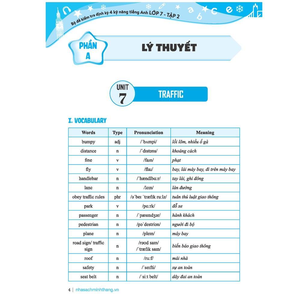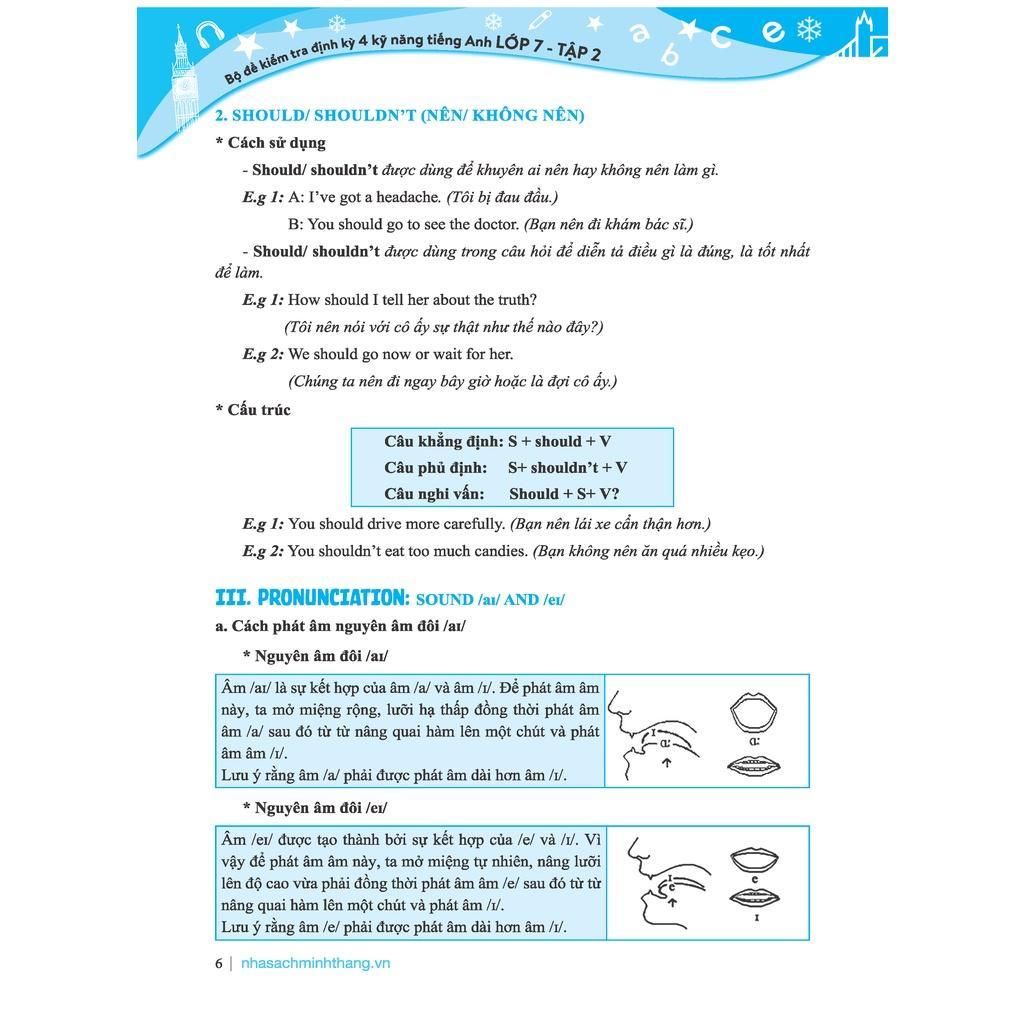 Trên hành trình tìm kiếm tri thức, các em thường xuyên phải đối mặt với các bài kiểm tra định kì, khiến các em cảm thấy căng thẳng, lo lắng và đôi khi kết quả không như mong đợi. Điều này không hẳn do các em chưa thật sự chăm chỉ hay không hiểu bài dẫn đến kết quả không đạt được như kỳ vọng, đôi khi còn phụ thuộc vào nhiều yếu tố như kĩ năng làm bài, kĩ năng quản lý thời gian hay chưa nắm được kết cấu đề thi... Thấu hiểu được những khó khăn và những tình huống các em thường gặp phải, nhóm tác giả đã dành nhiều thời gian biên soạn “Bộ đề kiểm tra định kỳ 4 kỹ năng nghe - nói - đọc - viết Tiếng Anh lớp 7” nhằm rên luyện cho các em kĩ năng làm bài thi, làm chủ các dạng đề, hiểu được kết cấu và cách thức ra đề của từng kỳ thi. Khi các em đã quen với các dạng bài tập và trải nghiệm làm đề thường xuyên thì việc tự tin trước các kỳ thi là điều hiển nhiên có được.