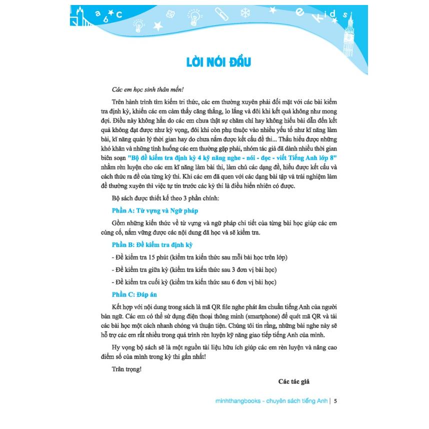 "Bộ đề kiểm tra định kỳ 4 kỹ năng nghe - nói - đọc - viết Tiếng Anh lớp 8" nhằm rèn luyện cho các em kĩ năng làm bài thi, làm chủ các dạng đề, hiểu được kết cấu và cách thức ra đề của từng kỳ thi. Khi các em đã quen với các dạng bài tập và trải nghiệm làm đề thường xuyên thì việc tự tin trước các kỳ thi là điều hiển nhiên có được.