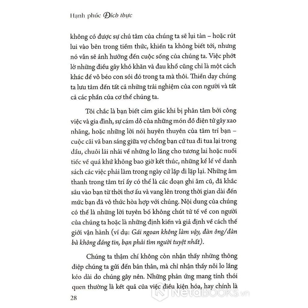 Hạnh Phúc Đích Thực – Sức Mạnh Của Thiền Hạnh phúc thực sự, vĩnh cửu không phải là kết quả của việc đáp ứng nhu cầu của bản thân một cách tạm thời. Thông qua thiền định, chúng ta kết nối với chính mình và sau đó kết nối với người khác. Nó nuôi dưỡng sự bình an và hạnh phúc vững bền. Thiền không phải là … Nhiều người có quan niệm sai lầm về thiền. Trước khi bắt đầu, chúng ta hãy cũng làm rõ một số điều như thế. Thiền không phải là một tôn giáo. Bạn không nhất thiết phải là người theo đạo Phật hay đạo Hinđu; bạn vẫn có thể hành thiền và giữ nguyên tôn giáo của mình hay thậm chí không cần theo tôn giáo nào cả. Thiền không đòi hỏi bất cứ một kĩ năng hay nền tảng gì đặc biệt. Bạn không cần phải học bất cứ thứ gì trước khi bắt đầu. Bạn có thể bắt đầu ngay lập tức. Nếu bạn thở được thì bạn thiền được. Thiền không đòi hỏi bạn phải bỏ nhiều thời gian để thực hành hàng ngày. Chúng ta sẽ đặt mục tiêu mỗi lần hành thiền 20 phút. Nếu muốn, bạn có thể bắt đầu từ 5 phút rồi tăng dần lên. Thiền không loại bỏ những nỗi buồn hoặc những thời điểm khó khăn khỏi cuộc sống của bạn. Bạn vẫn sẽ phải trải qua những thăng trầm, vui buồn. Nhưng bạn sẽ có thể thích nghi tốt với mọi chuyện hơn và cảm thấy khó gục ngã hơn, bởi vì thiền dạy chúng ta những cách mới mẻ để đối mặt với khó khăn. Thiền không phải là cố gắng ngừng suy nghĩ hoặc chỉ bám vào những suy nghĩ tích cực. Về mặt bản năng, con người không thể ngừng suy nghĩ. Thiền là cách để chúng ta nhận ra suy nghĩ của mình, quan sát và thấu hiểu chúng, kết nối vớ chúng một cách khéo léo hơn. Bạn không cần phải từ bỏ quan điểm, mục đích hay đam mê của mình, bạn không phải tránh xa nơi vui vẻ. Đưa hành thiền vào cuộc sống không có nghĩa là phải rút khỏi thế giới thực của những mối quan hệ, trách nhiệm, sự nghiệp, chính trị, thú vui hay những cuộc gặp gỡ. Mà trên thực tế, nó giải phóng chúng ta để chúng ta gắn kết với những điều mình quan tâm theo một cách lành mạnh hơn. Thiền không phải là tập trung nghiền ngẫm tâm tư. Hành thiền không phải là tự nuông chiều bản thân hay tự lấy mình làm trung tâm. Hòa hợp với chính mình là bước đầu tiên để hòa hợp với người khác. Thiền và con đường tìm tới hạnh phúc đích thực Thiền là gì? Đơn giản thôi, về cơ bản thiền là một cách rèn luyện khả năng chú ý để chúng ta có thể nhận thức rõ hơn, không chỉ những gì diễn ra bên trong chúng ta mà còn về những gì đang xảy ra xung quanh. Một khi nhìn rõ diễn biến trong những khoảnh khắc, chúng ta có thể quyết định phản ứng hay không và phản ứng như thế nào với điều mà chúng ta nhìn thấy.