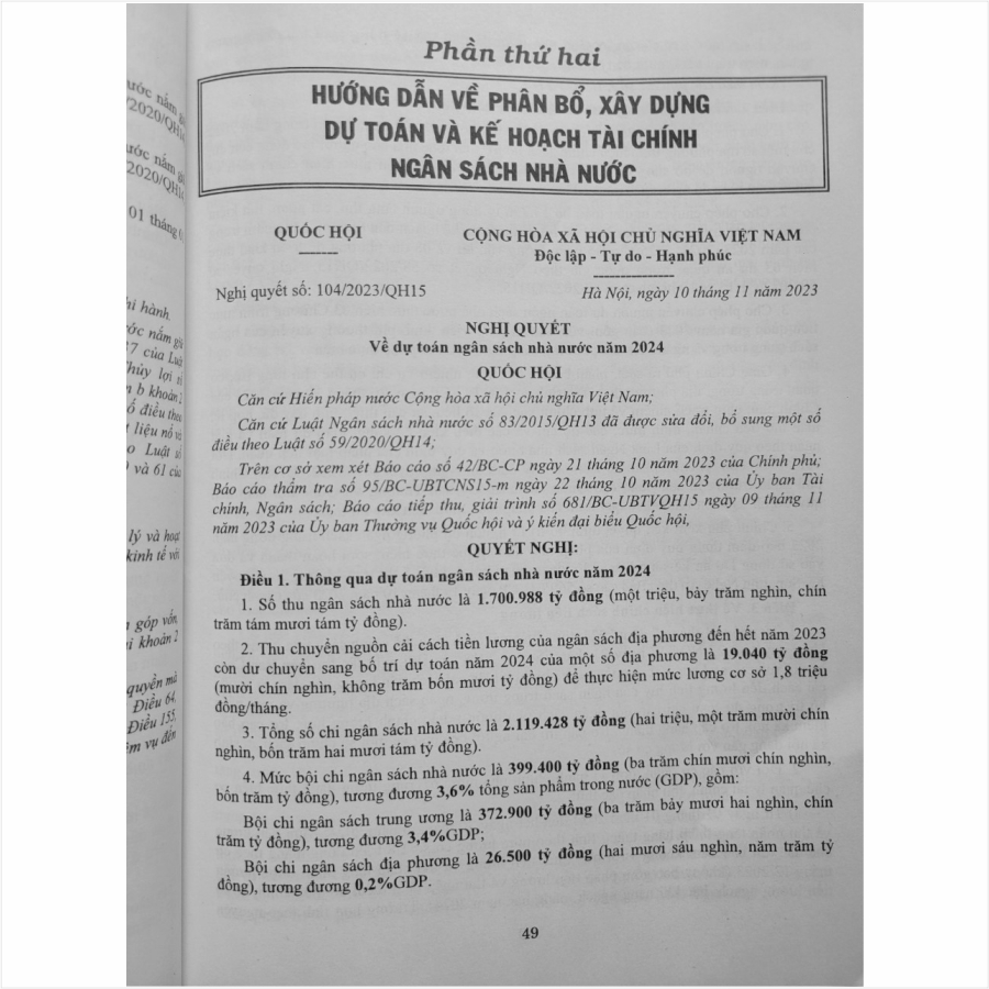 – Nghị quyết số 104/2023/QH15 ngày 10-11-2023 Về dự toán ngân sách nhà nước năm 2024;…