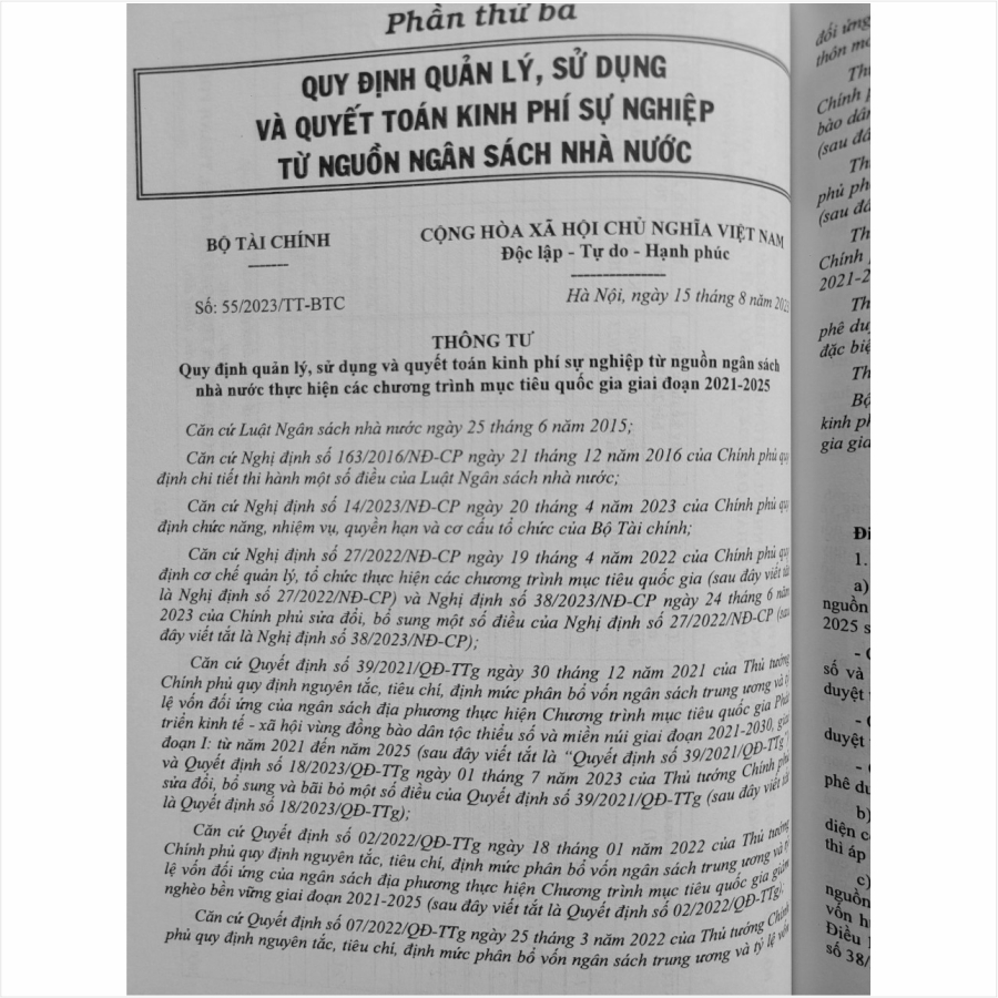 – Thông tư số 55/2023/TT-BTC ngày 15-8-2023 Quy định quản lý, sử dụng và quyết toán kinh phí sự nghiệp từ nguồn ngân sách nhà nước thực hiện các chương trình mục tiêu quốc gia giai đoạn 2021-2025;
