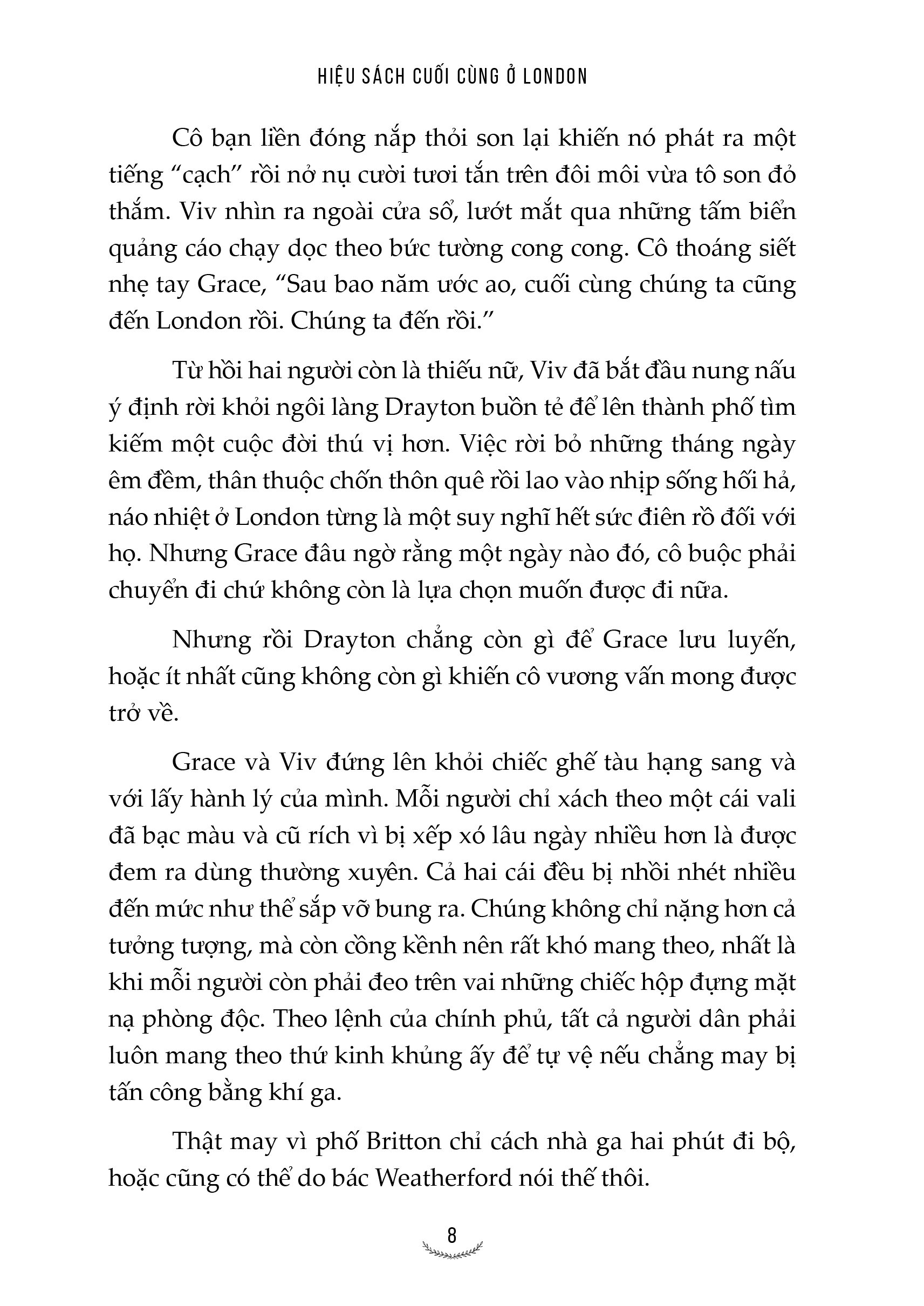 Hiệu sách cuối cùng ở London là cuốn tiểu thuyết tình cảm hấp dẫn, là những trang sử ghi lại quãng thời gian khó khăn của người dân London trong Chiến tranh Thế giới thứ Hai. Được truyền cảm hứng từ quá khứ có thật của số ít hiệu sách còn tồn tại sau cuộc oanh kích của Đức quốc xã, cuốn sách đã kể lại một câu chuyện về những mất mát của thời chiến, về tình yêu và sức mạnh của văn chương giúp con người ta vượt qua giai đoạn đen tối nhất.