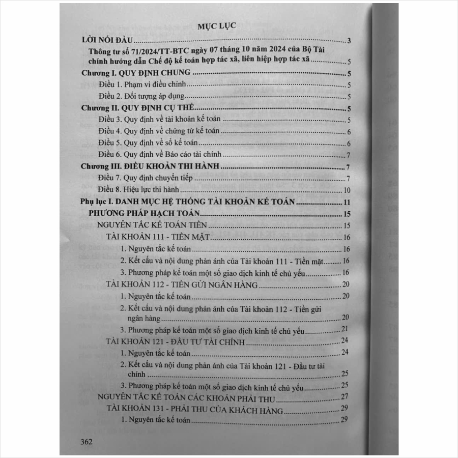 - Toàn bộ sách bìa mềm khổ lớn 19 x 27 cm phân phối bởi Nhà sách Nam Việt đều được bọc sách Plastic MIỄN PHÍ và xuất hóa đơn điện tử đầy đủ, nhanh chóng. …//… Lời giới thiệu: Ngày 07 tháng 10 năm 2024, Bộ Tài chính đã chính thức ban hành Thông tư số 71/2024/TT-BTC hướng dẫn Chế độ kếtoán hợp tác xã, liên hiệp hợp tác xã. Nhằm hướng dẫn về chứng từ kế toán, tài khoản kế toán, nguyên tắc ghi sổ kế toán, lập và trình bày Báo cáo tài chính của hợp tác xã, liên hiệp hợp tác xã; không áp dụng cho việc xác định nghĩa vụ thuế của hợp tác xã đối với ngân sách Nhà nước. Việc ghi sổ kế toán phải căn cứ vào các chứng từ kế toán được phản ánh trên cơ sở các giao dịch kinh tế phát sinh và đã hoàn thành. Hợp tác xã phải tuân thủ các quy định của pháp luật, cơ chế, chính sách liên quan khi thực hiện các giao dịch kinh tế. Nhằm phổ biến đến Quý Cơ quan, Đơn vị và Quý khách hàng thân thiết nắm bắt kịp thời những quy định mới nêu trên. Nhà sách Nam Việt xin trân trọng giới thiệu cuốn sách: Hướng Dẫn Chế Độ Kế Toán Hợp Tác Xã, Liên Hiệp Hợp Tác Xã theo Thông Tư Số 71/2024/TT-BTC ngày 07/10/2024 …//… Nội dung cuốn sách bao gồm những nội dung chính như sau: Chương I. QUY ĐỊNH CHUNG Chương II. QUY ĐỊNH CỤ THỂ Chương III. ĐIỀU KHOẢN THI HÀNH Phụ lục I. DANH MỤC HỆ THỐNG TÀI KHOẢN KẾ TOÁN Phụ lục II. DANH MỤC, BIỂU MẪU VÀ PHƯƠNG PHÁP LẬP CHỨNG TỪ KẾ TOÁN Phụ lục III. DANH MỤC SỔ KẾ TOÁN, BIỂU MẪU SỔ KẾ TOÁN VÀ PHƯƠNG PHÁP GHI SỔ KẾ TOÁN VÀ HÌNH THỨC SỔ KẾ TOÁN Phụ lục IV. BIỂU MẪU BÁO CÁO TÀI CHÍNH, NỘI DUNG VÀ PHƯƠNG PHÁP LẬP, TRÌNH BÀY BÁO CÁO TÀI CHÍNH *** Quý khách hàng hãy an tâm khi mua sách tại Nhà sách Nam Việt, cam kết uy tín, chất lượng, sách bản gốc chuẩn đẹp, được kiểm hàng, hài lòng mới thanh toán, sách đã được bọc plastic cao cấp miễn phí! …//… Cảm ơn các bạn đã ghé thăm shop Nhà sách Nam Việt ! Sách Hướng Dẫn Chế Độ Kế Toán Hợp Tác Xã, Liên Hiệp Hợp Tác Xã theo Thông Tư Số 71/2024/TT-BTC ngày 07/10/2024 Sách Hướng Dẫn Chế Độ Kế Toán Hợp Tác Xã, Liên Hiệp Hợp Tác Xã theo Thông Tư Số 71/2024/TT-BTC ngày 07/10/2024