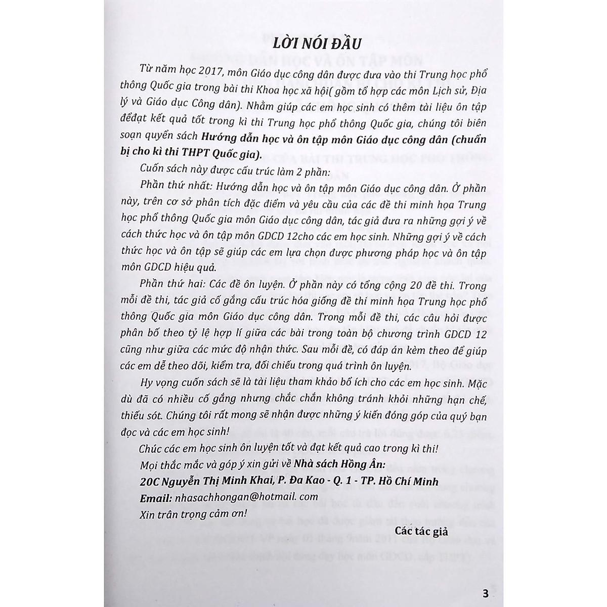 Từ năm 2017, môn Giáo dục công dân được đưa vào thi Trung học phổ thông Quốc gia trong bài thi Khoa học xã hội (gồm tổ hợp các môn Lịch sử, Địa lý và Giáo dục Công dân). Nhằm giúp các em học sinh có thêm tài liệu ôn tập để đạt kết quả tốt trong kì thi Trung học phổ thông Quốc gia, các tác giả biên soạn cuốn sách Hướng Dẫn Học Và Ôn Tập Môn Giáo Dục Công Dân (chuẩn bị cho kì thi THPT Quốc gia).
