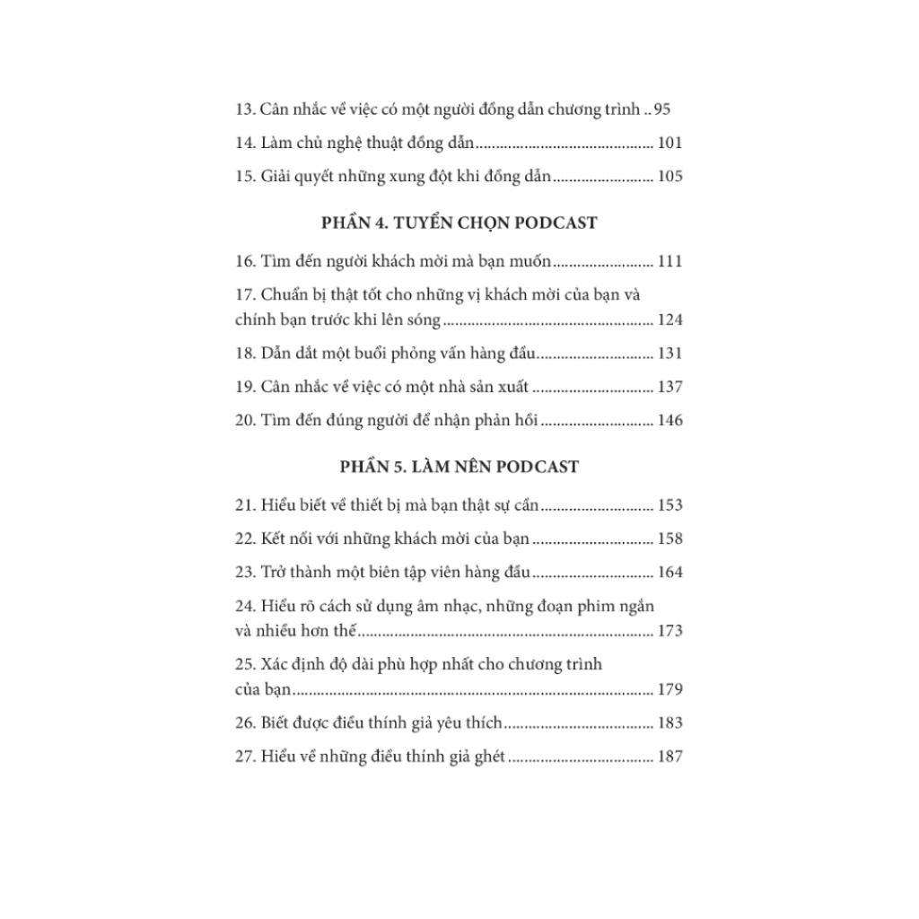 • Vì sao lại là podcast? Một câu hỏi tưởng chừng đơn giản nhưng rất khó trả lời, đó là :Tại sao bạn muốn bắt đầu một podcast?" Vì mọi người đang làm nên bạn cũng phải làm hay một nguyên nhân khác cá nhân hơn, bạn thích kể chuyện bằng chính giọng nói của mình và muốn bắt đầu chương trình của riêng mình. Nếu muốn thế giới lắng nghe nội dung của bạn, hãy kể câu chuyện một cách chân thực và truyền tải thông điệp thật đẹp đẽ. Nội dung ấy có thể được chia sẻ theo nhiều dạng podcast khác nhau nhưng phải đảm bảo sự ấn tượng và thu hút. Các dạng podcast phổ biến gồm: phỏng vấn, bàn tròn, tin tức hàng ngày, danh sách, lời khuyên, tóm tắt, phim tài liệu nhiều tập, phim tài liệu theo mùa, điều tra, tạp chí, game show, truyện ngắn tự sự, tiểu thuyết nhiều phần... Đa phần mọi người làm podcast sẽ sử dụng định dạng này. Tuy nhiên, bạn có thể tự tạo một định dạng của riêng mình, miễn là định dạng ấy đặc biệt, thú vị và thu hút người nghe. Mất bao lâu để người nghe hứng thú với podcast của bạn? Tuy nhiên, giống như một quyển sách, nếu phần mở đầu hấp dẫn, độc giả mới có hứng thú để lật mở những trang tiếp theo. Vì vậy, năm phút đầu tiên của một podcast cũng nên được đề cao. Trên thực tế, tỷ lệ người nghe bỏ cuộc trong 5 phút đầu tiên của một tập podcast cao hơn so với bất kỳ thời điểm nào khác. Do đó, những người làm podcast nên dành 50 giờ để thành thạo 5 phút đầu tiên của một tập phát thanh. Chỉ cần có đủ sự kiên trì, những nỗ lực của bạn sẽ được đền đáp xứng đáng. Nên viết những câu ngắn hay câu phức tạp? Cái hay của podcast là bạn có thể tạo ra cả một vũ trụ mà không cần đến hàng triệu USD hay phí thuê nhà hát. Đa số độc giả đến với podcast để lắng nghe những câu chuyện, ngược lại, nếu chỉ muốn sự thật, họ sẽ đọc báo hoặc bách khoa toàn thư. Vì vậy, nếu muốn có một chương trình podcast hay, hãy trở thành người kể chuyện xuất sắc. Nhưng thay vì đưa ra những sự thật hiển nhiên, bạn hãy tập trung kể câu chuyện của riêng mình. Khi kể, bạn đừng quên minh họa bằng từ ngữ giàu hình ảnh và cảm xúc để người nghe nhìn thấy trải nghiệm và hành động của nhân vật bằng trí tưởng tượng. Người làm podcast đang viết những câu chuyện cho đôi tai chứ không phải cho mắt nhìn. Khi viết cho tai nghĩa là bạn đang viết cho hơi thở, làm sao để khi kể chuyện có thể dễ đọc hơn và dễ nghe hơn. Do vậy, kịch bản podcast cần những câu ngắn gọn, từ ngữ ít âm tiết, ít vòng vo và đi thẳng vào vấn đề. Thông tin chi tiết cuốn sách Sách Hướng Dẫn Xây Kênh Podcast Từ A - Z - MCBooks