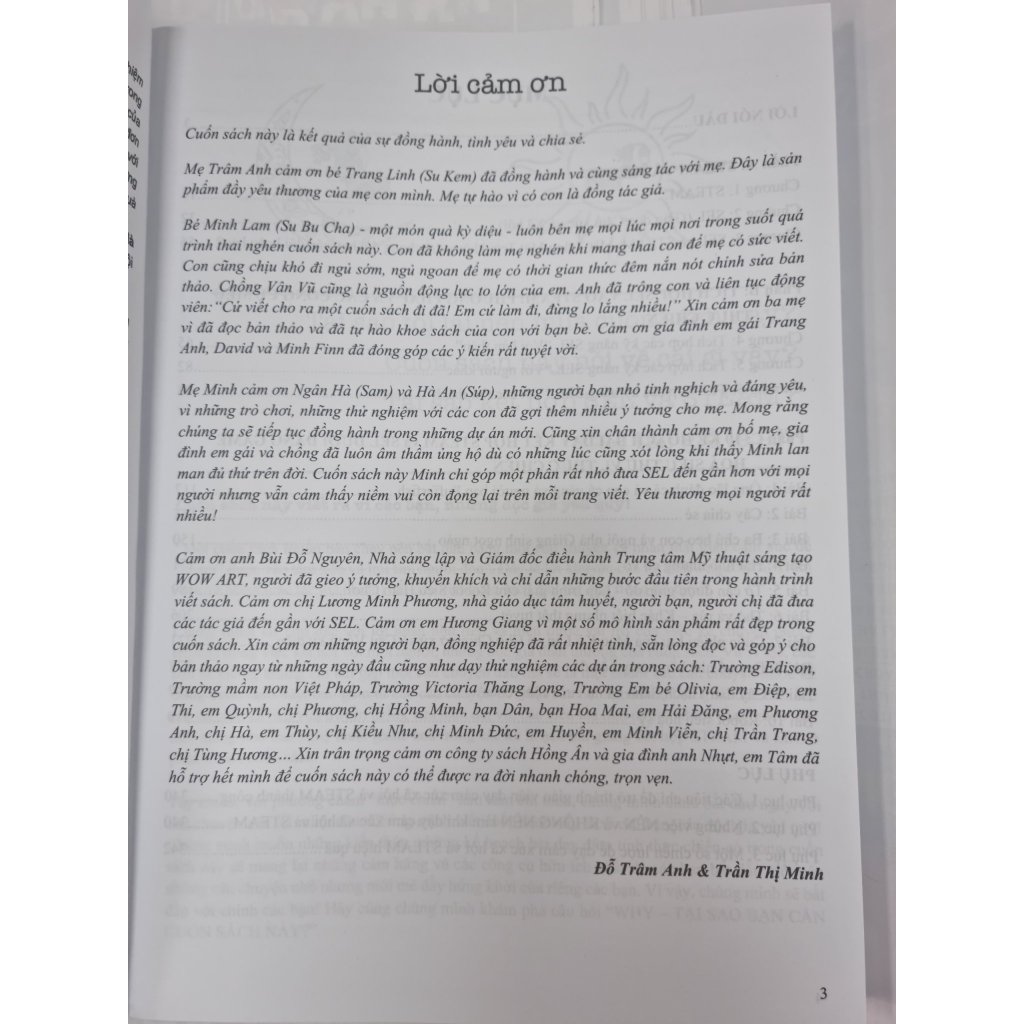 Mô tả sản phẩm Sách - Kết hợp giáo dục steam và giáo dục cảm xúc xã hội sel dành cho tiểu học và mầm non + Ha Cuốn sách này là kết quả của sự đồng hành, tình yêu và chia sẻ. Mẹ Trâm Anh cảm ơn bé Trang Linh (Su Kem) đã đồng hành và cùng sáng tác với mẹ. Đây là sản phẩm đầy yêu thương của mẹ con mình. Mẹ tự hào vì có con là đồng tác giả. Bé Minh Lam (Su Bu Cha) - một món quà kỳ diêu - luôn bên mẹ mọi lúc mọi nơi trong suốt qúa trình thai nghén cuốn sách này. Con đã không làm mẹ nghén khi mang thai con để mẹ có sức viết. Con cũng chịu khó đi ngủ sớm, ngủ ngoan để mẹ có thời gian thức đêm nắn nót chỉnh sửa bản thảo. Chồng Vân Vũ cũng là nguồn động lực to lớn của em. Anh đã trông con và liên tục động viên "Cứ viết cho ra một cuốn sách đi đã! Em cứ làm đi, đừng lo lắng nhiều" Xin cảm ơn ba mẹ vì đã đọc bản thảo và đã tự hào khoe sách của con với bạn bè. Cảm ơn gia đình em gái Trang Anh, David và Minh Finn đã đóng góp ý kiến rất tuyệt vời., Tác giả: Nhiều tác giả Công ty phát hành: nhà sách Hồng Ân Số trang: 343 Nhà Xuất Bản: Đại Học Quốc Gia Hà Nội Năm xuất bản: 2024