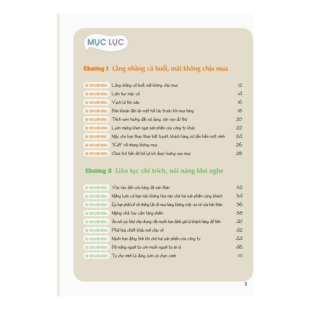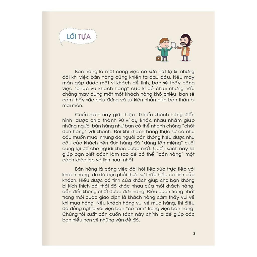 Cuốn sách này giới thiệu 10 kiểu khách hàng điển hình, được chia thành 90 ví dụ khác nhau nhằm giúp những người bán hàng như bạn có thể nhanh chóng chốt đơn hàng với khách. Đôi khi khách hàng thực sự có nhu cầu muốn mua , nhưng do người bán không hiểu được nhu cầu của khách nên đơn hàng đã “ dâng tận miệng “ cuối cùng lại để cho người khác cướp mất. Cuốn sách này sẽ giúp bạn biệt cách làm sao để có thể bán hàng một cách khéo léo và linh hoạt nhất.