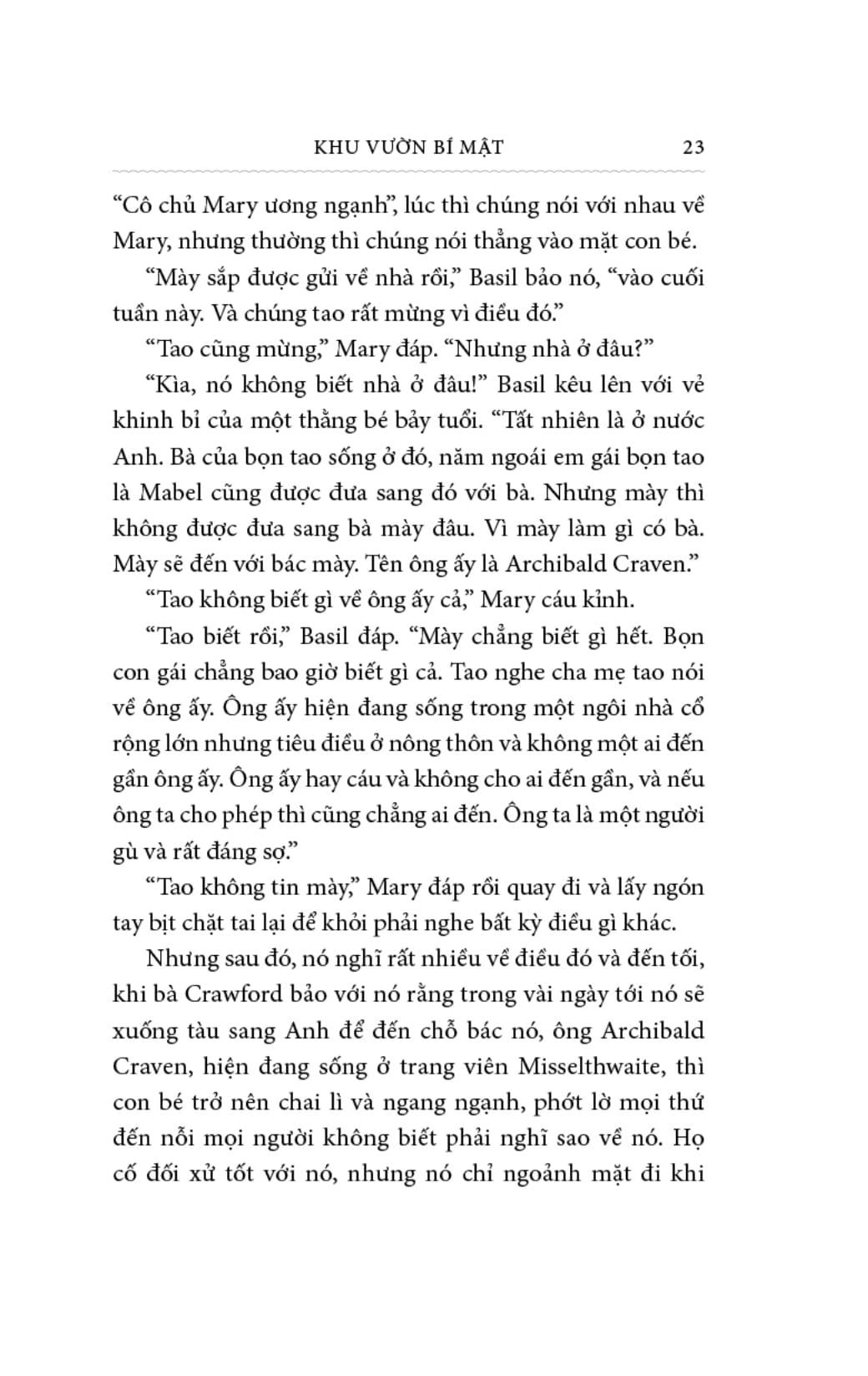 Khu vườn bí mật là câu chuyện kể về cô bé Mary Lennox mồ côi, cô độc và cáu kỉnh, phải chuyển đến sống tại trang viên Misselthwaite cùng người bác Archibald Craven góa vợ và người anh họ Colin ốm yếu. Tại đây, Mary đã khám phá ra khu vườn bí mật ẩn chứa thiên nhiên tươi đẹp, tìm cho m.ình những người bạn sẻ chia và mang đến phép mầu chữa lành cho trang viên Misselthwaite. Câu chuyện là bài học nhân văn về sức mạnh của tình yêu thương và niềm tin nơi con người, khuyến khích những mảnh đời bất hạnh có thể mở lòng và đón nhận những điều tốt đẹp vẫn còn ở xung quanh.