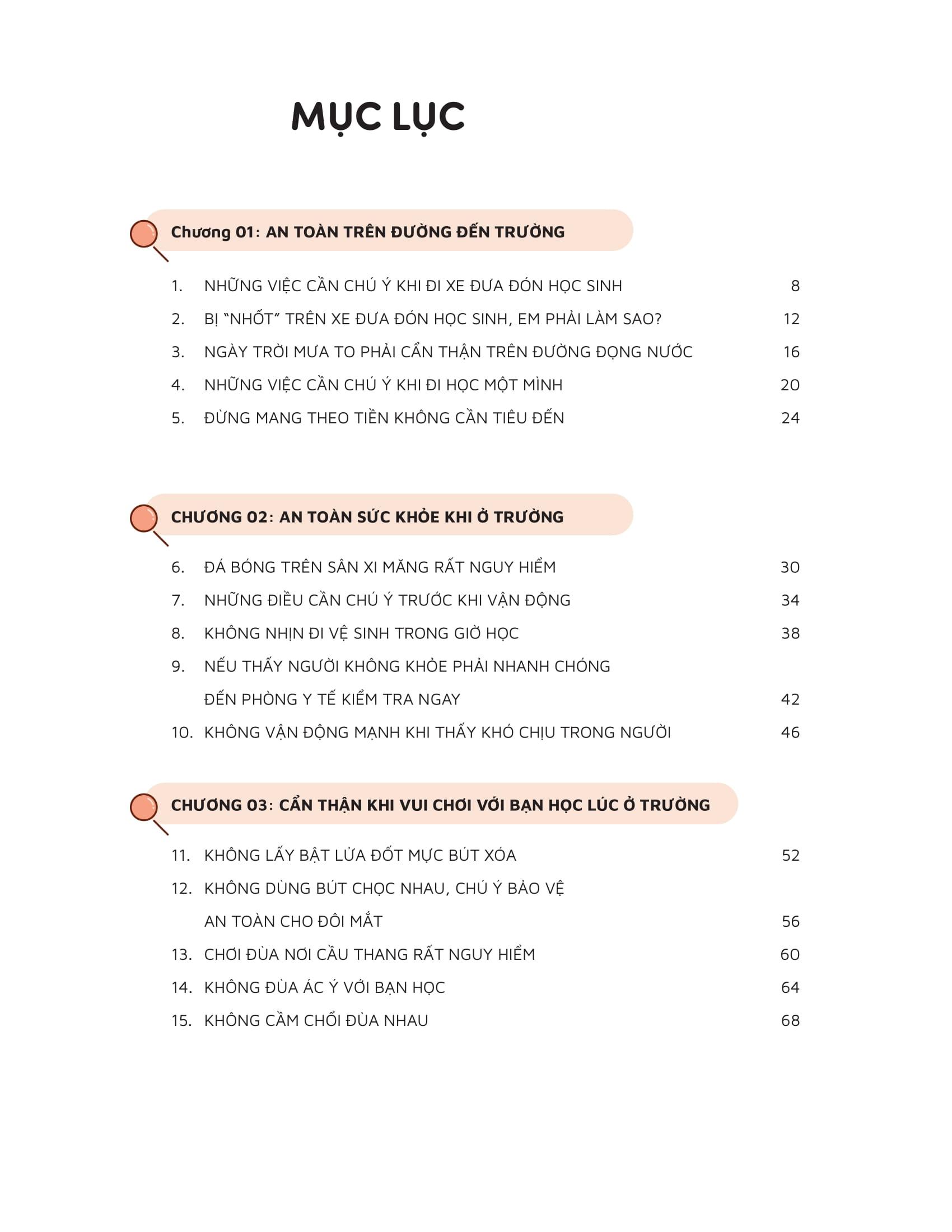 Cuốn sách gồm 5 chương với 35 bối cảnh, về cơ bản sẽ bao quát hết các khía cạnh đời sống học đường của trẻ. Cuốn sách này có thể coi như một bộ học liệu đào tạo có tính hệ thống để trẻ tự học về kiến thức an toàn khi đi học hoặc có thể coi như cẩm nang hướng dẫn giúp trẻ tìm ra câu trả lời cho các vấn đề an toàn tại trường học mà trẻ gặp phải.