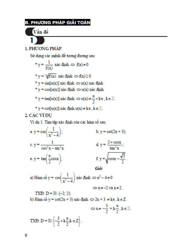 B. Phương pháp giải các dạng toán: Phần này được trình bày theo từng vấn đề. Mỗi vấn đề là một dạng toán thường gặp liên quan đến kiến thức của bài học tương ứng. Mỗi dạng toán đều có nêu các phương pháp giải, các ví dụ minh họa và các bài tập luyện tập dành cho người đọc. Các bài tập luyện tập đều có hướng dẫn giải hay đáp số nhằm giúp người đọc tự kiểm tra lại kết quả của mình. Cuối mỗi chương có các bài tập tổng hợp để giúp người học ôn tập các kiến thức đã học. Chúng tôi hy vọng cuốn sách sẽ là một tài liệu tham khảo hữu ích giúp người đọc dễ dàng tiếp cận, nắm vững và trau dồi kiến thức môn Toán 11 để đạt được kết quả tốt nhất trong kì thi tuyển sinh đại học.