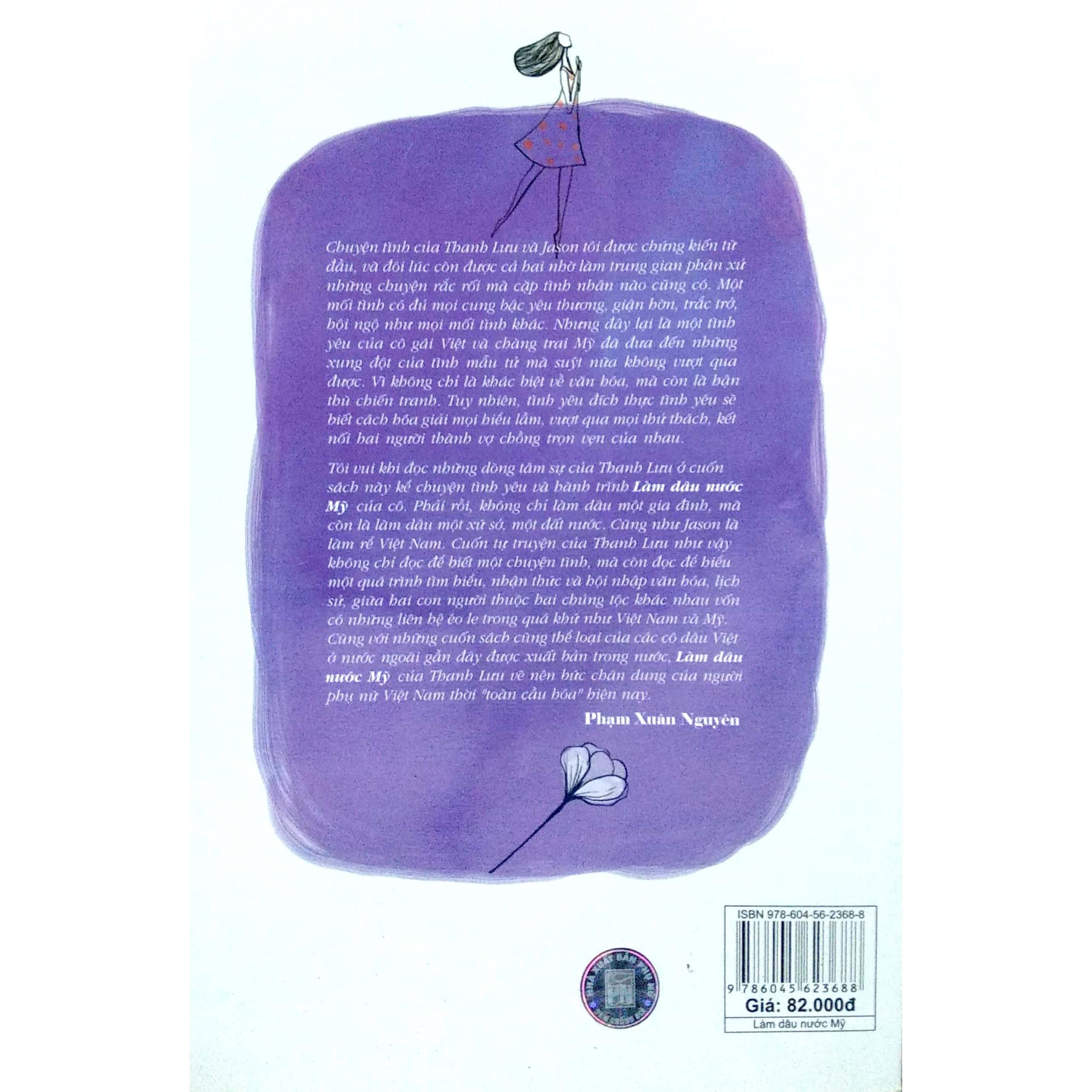 Làm Dâu Nước Mỹ Tiếp nối xê ri Làm dâu xứ lạ, cuốn tự truyện Làm dâu nước Mỹ của Nguyễn Thị Thanh Lưu chia sẻ hành trình làm dâu, làm vợ, làm mẹ ở một xứ xở khác, nơi được nhiều người gọi là “thiên đường”: nước Mỹ xa xôi. Mở đầu cuốn tự truyện là những trang nhật kí ghi lại những đắng ngọt, buồn vui trong chuyện tình của tác giả. Số phận như trêu ngươi khi gán ghép cô gái xứ Nghệ, con của một gia đình từng tham gia kháng chiến chống Mỹ với một chàng trai Mỹ. Sự am hiểu tường tận văn hóa Việt Nam của chàng trai Mỹ cũng khó dỡ bỏ được bức tường định kiến của gia đình trí thức xứ Nghệ yêu nước. Cô gái buộc phải đứng trước sự lựa chọn: hoặc gia đình đã nuôi dạy, chăm sóc và yêu thương cô hết mực, hoặc người con trai cô yêu bằng cả trái tim. Bản lĩnh và dám là chính mình, cô gái lựa chọn rời xa bàn tay chở che của mẹ trong một ngày mưa bão. “Cùng với việc sập cánh cửa nhà trước mặt tôi, mẹ tôi đã đẩy tôi về phía anh, một cách vô thức. Mẹ đã chấp nhận trao trả lại thứ tự do tôi hằng muốn, nhưng không quên tước đi của tôi quyền được có gia đình. Chắc mẹ muốn dạy tôi rằng, nếu tôi yêu tự do nhường ấy, tôi buộc phải trả giá. Cái giá ấy tôi không được quyền lựa chọn. Chính mẹ tôi - trong cơn phẫn nộ với đứa con gái ngang ngạnh đã mạnh tay ra giá đắt. Tôi nhận được món hàng tự do hằng mơ ước mà không chút hạnh phúc vì vẫn ngỡ ngàng trước cái giá cắt cổ mẹ tôi đưa ra”. Khi một con người dám đối diện và chiến đấu để vượt qua giông bão thì người đó có được hạnh phúc. Vượt qua những cản ngăn của mẹ và họ hàng, những hờn giận của tình yêu đôi lứa, Nguyễn Thị Thanh Lưu bắt đầu cuộc sống ở “thiên đường” nước Mỹ. Là người phụ nữ thông minh và bản lĩnh, cô không khó để hòa nhập với văn hóa nơi đây. Cô ý thức được Xứ lạ là thầy - để bắt đầu học hỏi và hòa nhập với văn hóa Mỹ từ những trải nghiệm đầu tiên ở bệnh viện Mỹ trong lần sinh Rau Muống, tới việc đi hộp đêm ở Mỹ phải chuẩn bị những gì để không bị “quê”, bài học về quyền ưu tiên khi lái xe ở Mỹ và ngay cả chuyện đổ rác sao cho đúng cách - một việc tưởng chừng rất nhỏ ở Việt Nam. Khi nước Mỹ đã không còn là xứ lạ thì Nước Mỹ là nhà. Nguyễn Thị Thanh Lưu không giấu nổi niềm hạnh phúc khi chia sẻ về gia đình nhỏ của mình với hai đứa con Cà Kiu và Rau Muống thông minh và đáng yêu, với người chồng luôn thấu hiểu và yêu thương, đặc biệt là có cùng đam mê đọc sách, với bố chồng luôn kiên nhẫn chờ con dâu “đếm cơm” xong mới rời khỏi bàn ăn, với mẹ chồng tâm lý luôn “vô tình” chia sẻ cho con dâu những mẹo vặt hoặc công thức nấu ăn ngon cũng như những tri thức hiểu biết về văn hóa, chính trị nước Mỹ. Chính tình yêu thương của những thành viên trong gia đình đã xóa nhòa khoảng cách giữa hai nền văn hóa Mỹ - Việt, để mái ấm của cô luôn tràn ngập tiếng cười. “Vì những yêu thương của bố mẹ chồng, nước Mỹ xa lạ đã trở thành mái nhà ấm áp của tôi - nơi tôi đi xa bắt đầu thấy nhớ và mong được trở về. Và đúng như tôi đã dự đoán, ngày tôi coi việc đặt chân trên đất Mỹ là ngày về cuối cùng đã đến, tự nhiên như chính tình cảm tôi dành cho quê hương mới của tôi”. Bên cạnh những trải nghiệm làm dâu, làm vợ, làm mẹ, Nguyễn Thị Thanh Lưu còn chia sẻ những câu chuyện của bạn bè mà cô gặp trên đất Mỹ. Qua những người bạn với những suy nghĩ sâu sắc, nhân văn. Qua những câu chuyện đó, cuốn tự truyện cũng thể hiện nhận thức và suy nghĩ của tác giả về khát vọng chung của rất nhiều người trên thế giới đã trở thành trào lưu là được trở thành công dân của nước Mỹ “thiên đường”. Và tác giả đã khẳng định “Có 101 con đường đến Mỹ nhưng qua những câu chuyện tôi được biết, tôi dám chắc rằng, không phải con đường nào cũng dẫn đến thiên đường”. Hạnh phúc ở thiên đường nước Mỹ như thế, nhưng Nguyễn Thị Thanh Lưu vẫn không kìn nén nổi nỗi buồn xa xứ man mác, mỗi lần nhớ nhà, cô lại nấu những món ăn quê hương như một cách để trở về trong hoài niệm, và đó cũng là cách để những đứa con thơ hiểu và yêu thêm quê mẹ Việt Nam. Khi bắt đầu đặt chân đến Mỹ, Nguyễn Thị Thanh Lưu còn băn khoăn tự hỏi, mình đi hay về Mỹ nhưng khi khép lại cuốn sách, cô đã có câu trả lời: “Mỗi ngày trên xứ lạ là một ngày tôi cố gắng học yêu và sống, để xứ lạ rồi sẽ là đất quen, để thay vì nghĩ đến nước Mỹ là nghĩ đến sự ra đi, tôi sẽ bắt đầu coi đó là nơi chốn trở về, là một quê hương mới”. Nguyễn Thị Thanh Lưu đã dám sống, dám yêu, dám được là chính mình và cuối cùng có được hạnh phúc trọn vẹn. Cuốn tự truyện lại là một minh chứng nữa cho cội nguồn hạnh phúc của nhữ