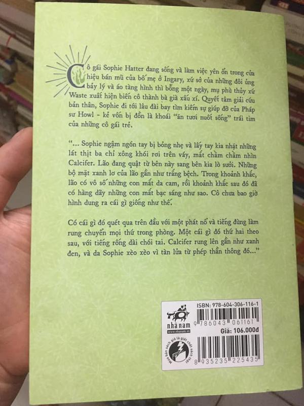 “…Sophie ngậm ngón tay bị bỏng nhẹ và lấy tay kia nhặt những lát thịt ba chỉ xông khói rơi trên váy, mắt chằm chằm nhìn Calcifer. Lão đang quật từ bên này sang bên kia lò sưởi. Những bộ mặt xanh lơ của lão gần như trắng bệch. Trong khoảnh khắc, lão có vô số những con mắt da cam, rồi khoảnh khắc sau đó đã có hàng dãy những con mắt bạc sáng như sao. Cô chưa bao giờ hình dung ra cái gì giống như thế.