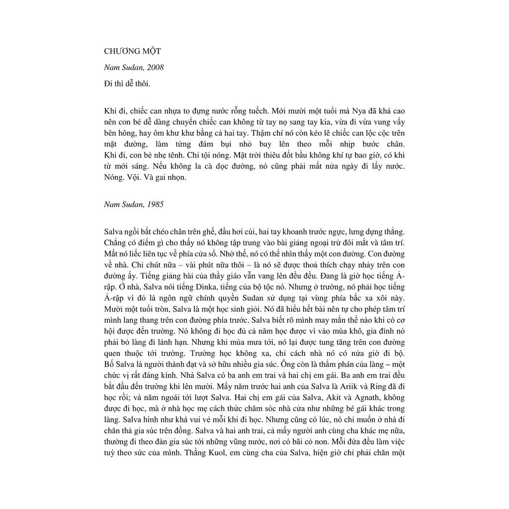 nữa. Nó lê từng bước. Liên tục như vậy trong mấy giờ đồng hồ cho tới khi mặt trời gần tắt hẳn. Đi cùng nó còn rất nhiều người nữa. Nhiều đến mức mà nó chắc rằng nguyên làng, nơi có trường nó học, cũng không thể nhiều người đến vậy. Hẳn là toàn bộ số người của cả vùng đất này đang cùng di tản. Vừa đi, những ý nghĩ miên man cứ hiện lên trong đầu Salva theo từng nhịp bước. Mình đang đi đâu đây? Gia đình mình đâu? Liệu mình có còn đượcgặp lại gia đình không?Đoàn người dừng lại khi trời tối hẳn không còn nhìn thấy lối đi nữa. Ban đầu họ đứng tản mát, thi thoảng có vài tiếng rì rầm, nhưng phần lớn đều lặng im trong sợ hãi.
