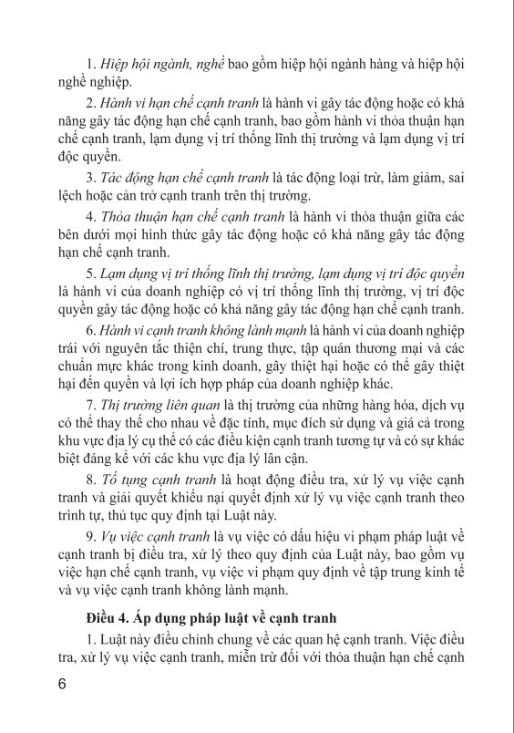 Tác Giả: Nhiều Tác Giả Nhà cung cấp ndbooks Nhà Xuất Bản: Nhà Xuất Bản Lao Động Năm Xuất Bản: 2025 Kích Thước: 14.5 x 20.5 cm Loại Bìa: Bìa Mềm Số Trang: 76 Trọng Lượng: 300g QUỐC HỘI Luật số: 23/2018/QH14 CỘNG HOÀ XÃ HỘI CHỦ NGHĨA VIỆT NAM Độc lập – Tự do - Hạnh phúc LUẬT CẠNH TRANH Căn cứ Hiến pháp nước Cộng hòa xã hội chủ nghĩa Việt Nam; Quốc hội ban hành Luật Cạnh tranh. Chương I NHỮNG QUY ĐỊNH CHUNG Điều 1. Phạm vi điều chỉnh Luật này quy định về hành vi hạn chế cạnh tranh, tập trung kinh tế gây tác động hoặc có khả năng gây tác động hạn chế cạnh tranh đến thị trường Việt Nam; hành vi cạnh tranh không lành mạnh; tố tụng cạnh tranh; xử lý vi phạm pháp luật về cạnh tranh; quản lý nhà nước về cạnh tranh. Điều 2. Đối tượng áp dụng