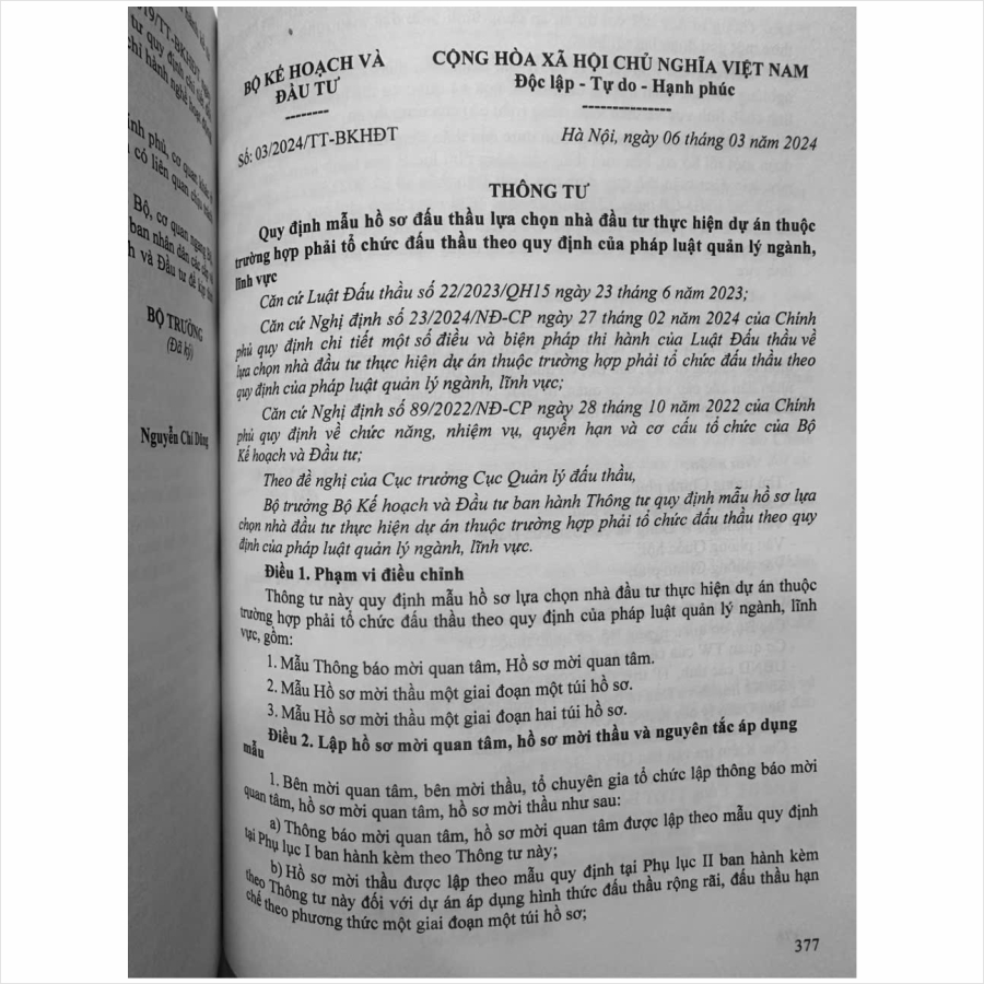 – Thông tư số 01/2024/TT-BKHĐT ngày 15 tháng 02 năm 2024 của Bộ Kế hoạch và Đầu tư hướng dẫn việc cung cấp, đăng tải thông tin về lựa chọn nhà thầu và mẫu hồ sơ đấu thầu trên Hệ thống mạng đấu thầu quốc gia;