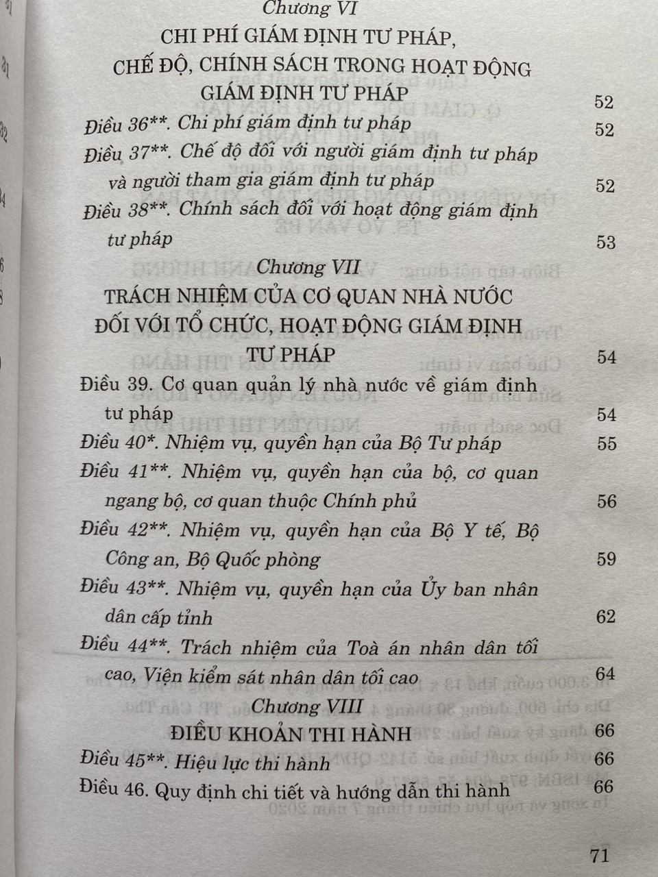 Luật Giám định tư pháp (hiện hành) (sửa đổi, bổ sung năm 2018, 2020) gồm 7 chương, 46 điều, quy định về: giám định viên tư pháp; tổ chức giám định tư pháp; người giám định tư pháp theo vụ việc, tổ chứ...