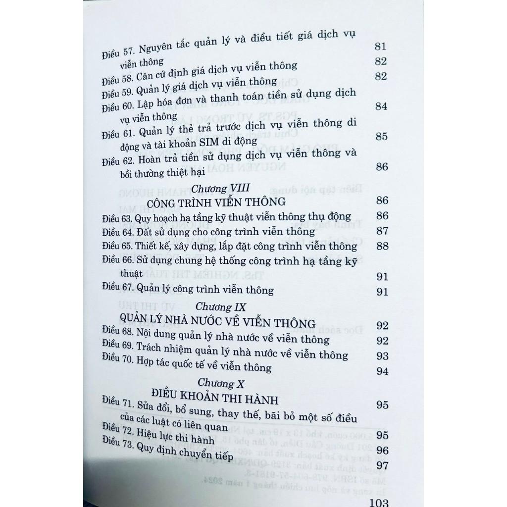 Luật Viễn thông năm 2023 được Quốc hội khóa XV, kỳ họp thứ 6 thông qua ngày 24/11/2023, có hiệu lực thi hành từ ngày 01/7/2024. Luật gồm 10 chương, 73 điều, có những điểm mới cơ bản như: mở rộng phạm vi điều chỉnh một số dịch vụ mới như: dịch vụ trung tâm dữ liệu, dịch vụ điện toán đám mây, dịch vụ viễn thông cơ bản trên Internet để phù hợp với xu thế chuyển đổi hạ tầng viễn thông thành hạ tầng số; bổ sung các quy định về phát triển hạ tầng viễn thông; bổ sung hoàn thiện các quy định về hoạt động viễn thông công ích; quy định cụ thể các loại tài nguyên viễn thông được phân bổ qua hình thức đấu giá; bổ sung quy định về ngăn chặn sim rác, tin nhắn rác, cuộc gọi vi phạm pháp luật; cải cách thủ tục hành chính, quản lý thị trường viễn thông…