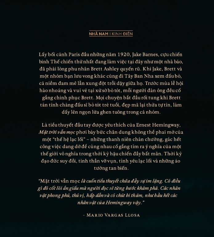Là tiểu thuyết đầu tay được yêu thích của Ernest Hemingway, Mặt trời vẫn mọc phơi bày bức chân dung không thể phai mở của một “thế hệ lạc lối” – những thanh niên chán chường, gác hết công việc dang dở để cùng nhau cố gắng tìm ra ý nghĩa của một thế giới vô nghĩa trong thời kỳ hậu chiến đầy bất mãn. Thời kỳ đạo đức suy đồi, tinh thần vỡ vụn, tình yêu lạc lối và những ảo tưởng tan biến.