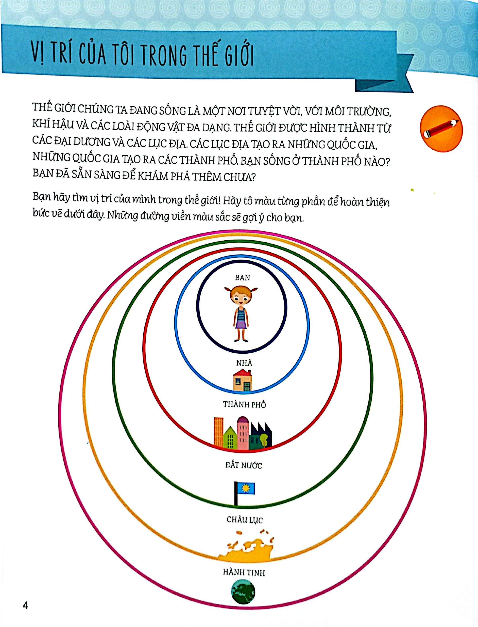 Cuốn sách có hướng tiếp cận rõ ràng và logic, dễ hiểu, với mục tiêu cuối cùng là giúp trẻ hình thành những hiểu biết cơ bản về khái niệm địa lí. Đầu tiên, trẻ được tìm hiểu xem những gì tạo nên một thành phố, một quốc gia và một lục địa. Các em sẽ thấy những điểm tương đồng và khác biệt giữa nơi m.ình sống với phần còn lại của thế giới. Thông qua quá trình tích lũy tăng dần (từ các viên gạch nhỏ ghép lại tạo nên một kết cấu lớn hơn vững chắc duy nhất), trẻ sẽ hình dung được kích thước tăng dần của các thực thể trong không gian. Các em sẽ bắt đầu từ bản thân, sau đó hướng tới gia đình, và ngôi nhà của chính m.ình, cho đến khi chạm tới điểm cuối cùng là chiều không gian của hành tinh. Những hoạt động cụ thể xuyên suốt cuốn sách này tập trung vào các cấp độ đó, trong đó tập trung nhiều hơn đến các lục địa và đại dương trên thế giới, là những vật chất cơ bản cấu tạo nên hành tinh của chúng ta.