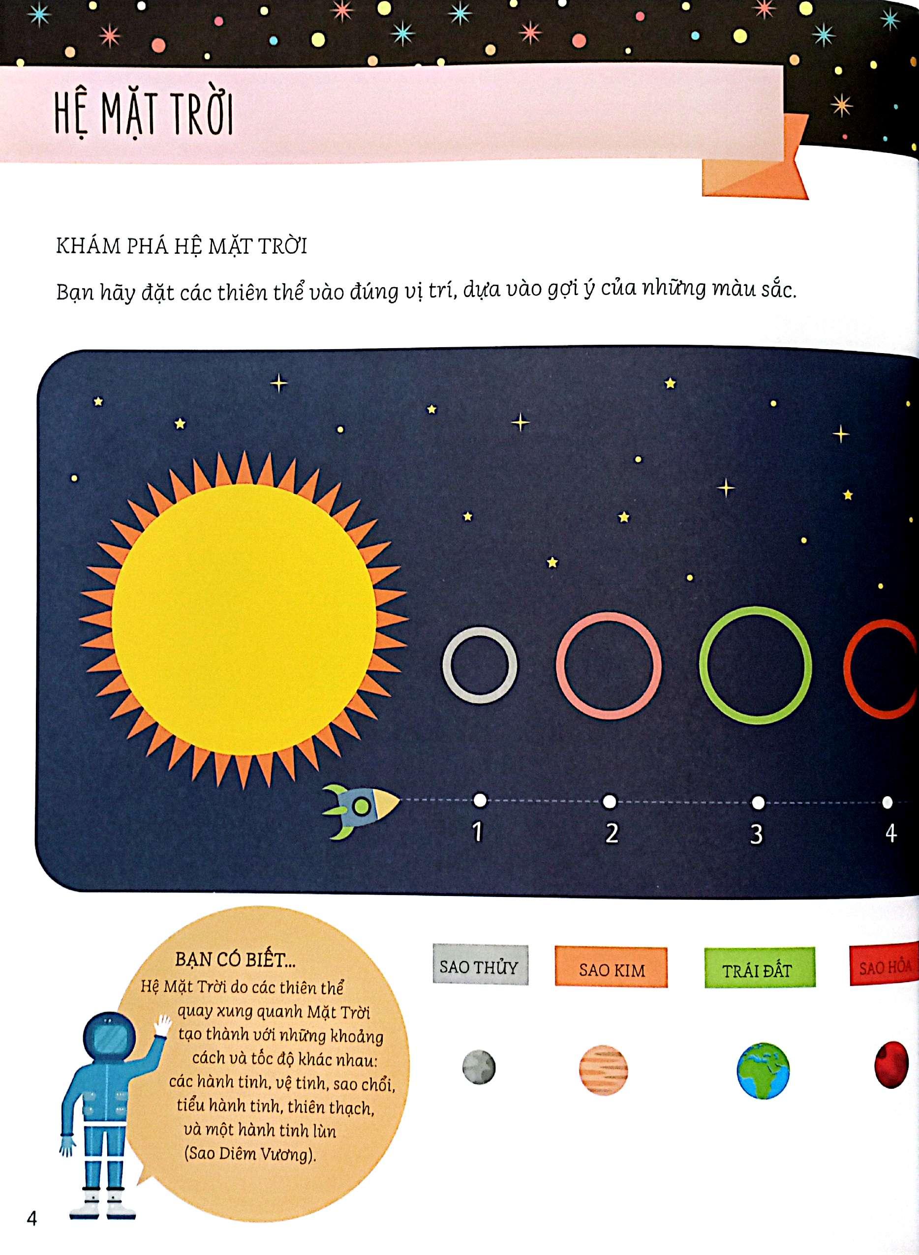 Cuốn sách đầu tiên về Vũ trụ dành cho trẻ là một cuốn sách hoàn hảo để giới thiệu cho trẻ lứa tuổi từ 5+. Cuốn sách có minh họa các thành phần quan trọng nhất trong Hệ Mặt Trời, đơn giản hóa các khái niệm phức tạp thông qua những hoạt động vui tươi và sáng tạo lấy cảm hứng từ phương pháp Montessori. Qua mỗi trang sách, trẻ được tìm hiểu các hành tinh trong Hệ Mặt Trời - phân biệt chúng dựa trên kích thước, màu sắc, vị trí - và khám phá các thành tố khác của không gian như: sao chổi, tiểu hành tinh, vệ tinh, chòm sao và Trạm Vũ trụ Quốc tế.