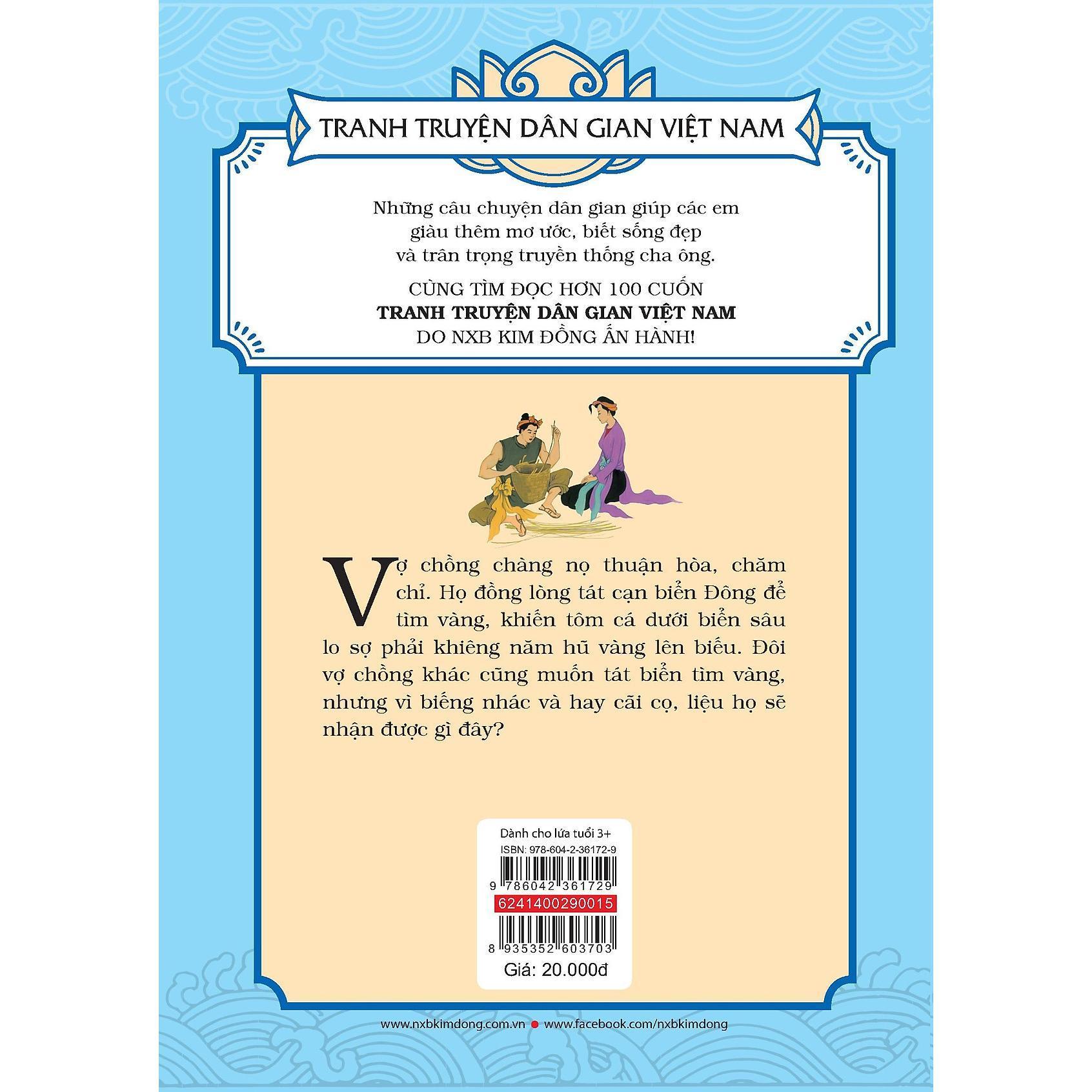 Vợ chồng chàng nọ thuận hòa, chăm chỉ. Họ đồng lòng tát cạn biển Đông để tìm vàng, khiến tôm cá dưới biển sâu lo sợ phải khiêng năm hũ vàng lên biếu. Đôi vợ chồng khác cũng muốn tát biển tìm vàng, nhưng vì biếc nhác và hay cãi cọ, liệu họ nhận được gì đây?