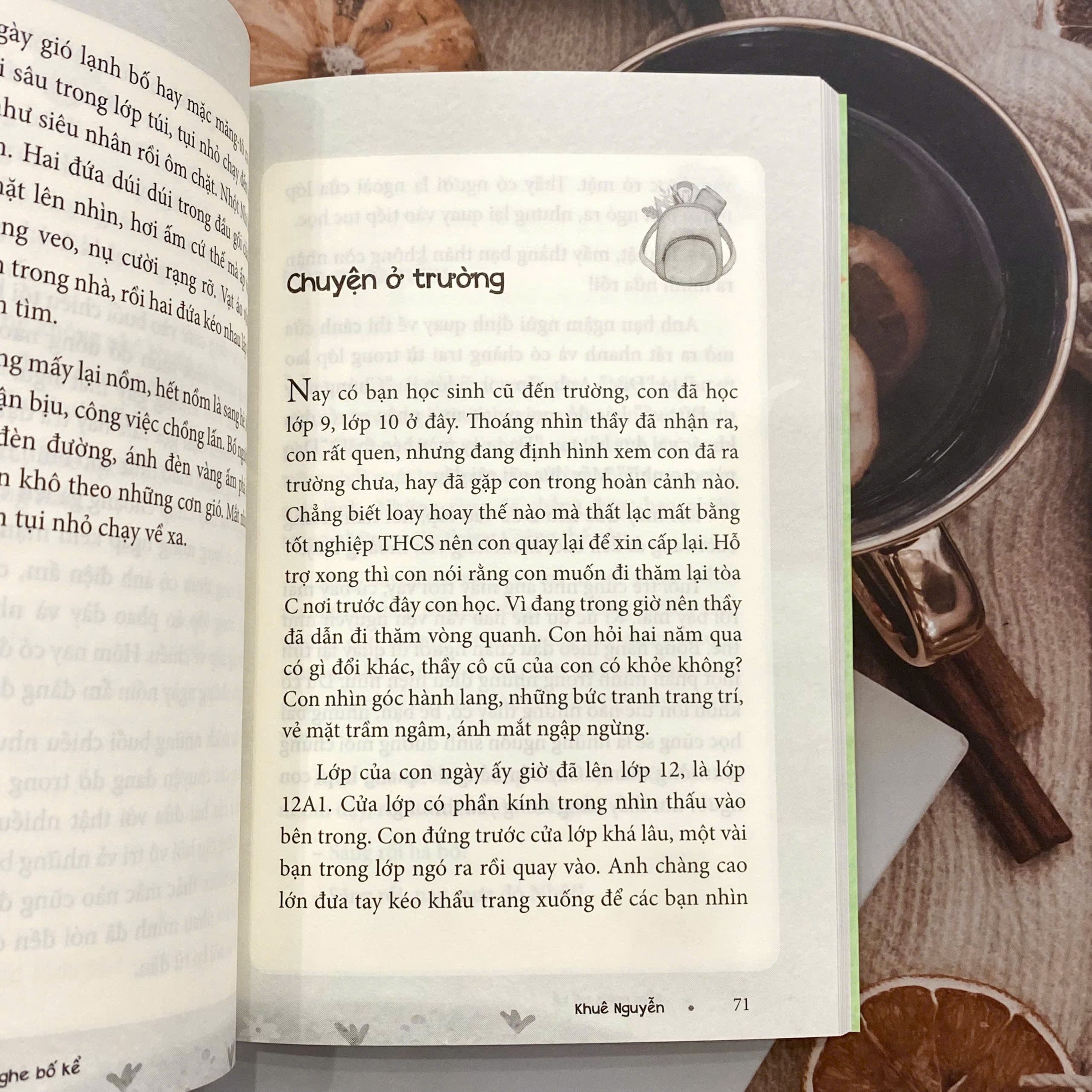 “Nằm nghe bố kể” là một cuốn tản văn ấm áp, nhẹ nhàng và thân thương như chính cái tên của nó. Cuốn sách là những lát cắt vụn vặt nhưng đầy yêu thương trong đời sống thường nhật của một người bố – người vừa vụng về, vừa dịu dàng, vừa can đảm trên hành trình làm cha.