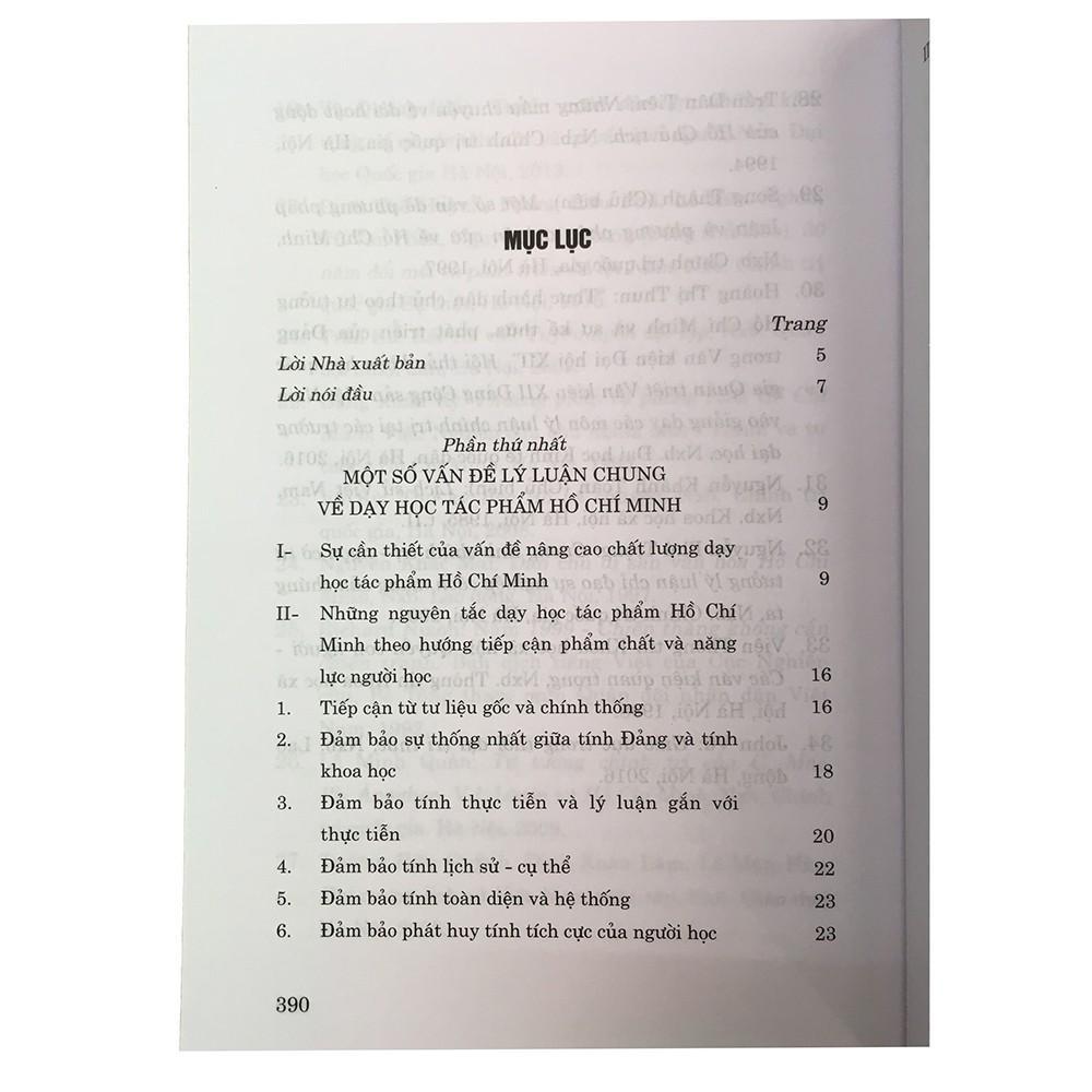 Nội dung cuốn sách gồm hai phần: Phần thứ nhất nêu một số vấn đề lý luận chung về dạy học tác phẩm Hồ Chí Minh; Phần thứ hai giới thiệu một số tác phẩm tiêu biểu của Hồ Chí Minh (như: Bản án chế độ thực dân Pháp, Đường kách mệnh, Cương lĩnh chính trị đầu tiên, Tuyên ngôn độc lập...). Trong mỗi tác phẩm, các tác giả xác định mục tiêu dạy học tác phẩm (năng lực, phẩm chất), hoàn cảnh ra đời và bố cục của tác phẩm, nội dung cơ bản của tác phẩm, giá trị của tác phẩm và một số câu hỏi ôn tập, củng cố...