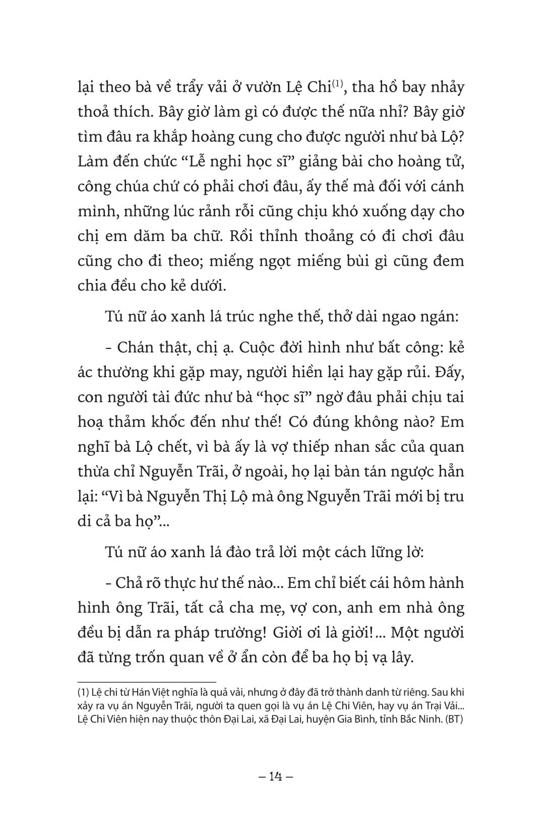 “Nhà vua hít một hơi thật dài. Gió từ mạn sông Thiên Đức thổi về mang theo mùi thơm mát lịm của những quả lệ chi vừa nở cùi chín rộ. Nhà vua sửa lại khăn áo và ngửa mặt nhìn lên bầu trời cao lồng lộng. Xa xa, về phương Nam, lấm tấm giữa những vì sao đêm, ngôi sao Khuê đang lấp lánh…”
