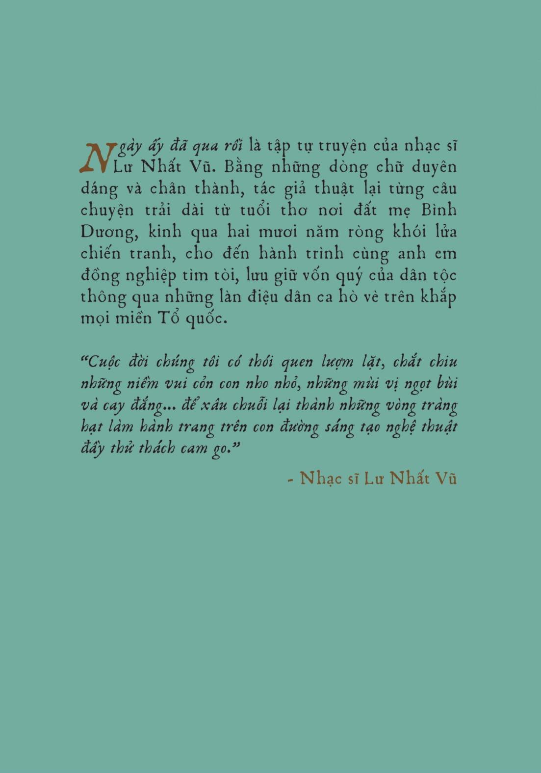 Ngày ấy đã qua rồi là tập tự truyện của nhạc sĩ Lư Nhất Vũ. Qua 36 mẩu chuyện nhỏ, tác giả giúp người đọc biết thêm về con đường đến với cách mạng của một thanh niên miền Nam vượt tuyến, đi TNXP rồi được đào tạo thành nhạc sĩ trên đất Bắc và trở lại miền Nam, đem tiếng đàn tiếng hát phục vụ sự nghiệp chiến đấu giải phóng dân tộc. Hòa bình lập lại, ông lại trở thành một trong những người có ý thức bảo tồn vốn quý của dân tộc thông qua những bài dân ca hò vè. Con đường đi tìm “vàng” trong dân gian không những đã giúp ông trở thành người mà ai cũng biết, mà còn hơn thế nữa, ông là người đã phả hơi thở sống động vào việc lưu giữ và phát triển vốn quý của dân tộc là dân ca trên khắp mọi miền đất nước.