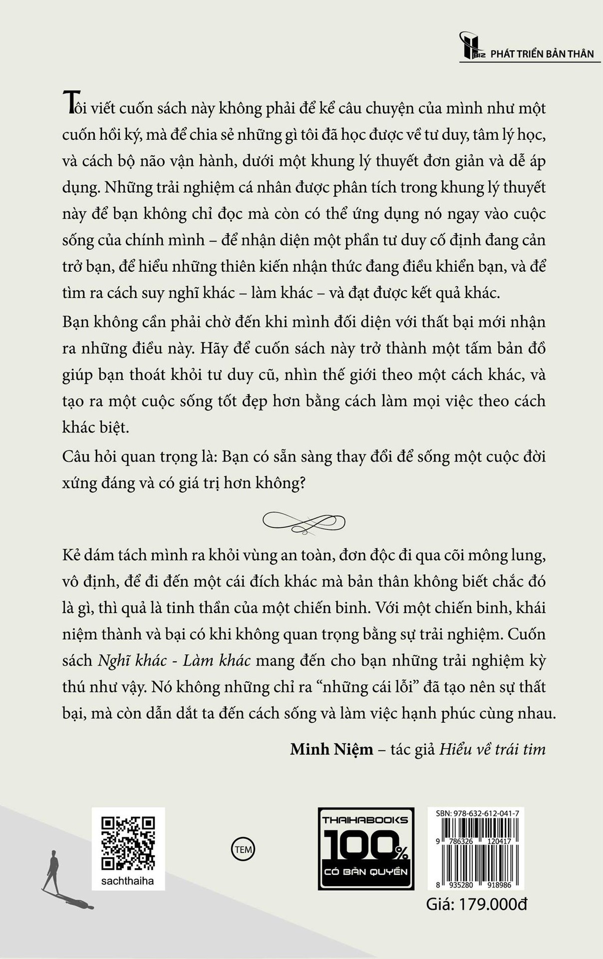 Cuốn sách Nghĩ khác - Làm khác không phải để kể câu chuyện của tác giả, từ một giáo sư danh giá đến khởi nghiệp thất bại, chạm đáy vực thẳm và tự mình đứng dậy, mà hơn hết để chia sẻ những gì ông đã học được về tư duy, tâm lý học, và cách bộ não vận hành, dưới một khung lý thuyết đơn giản và dễ áp dụng. Những trải nghiệm cá nhân được phân tích trong khung lý thuyết này để bạn không chỉ đọc mà còn có thể ứng dụng nó ngay vào cuộc sống của chính mình – để nhận diện một phần tư duy cố định đang cản trở bạn, để hiểu những thiên kiến nhận thức đang điều khiển bạn, và để tìm ra cách suy nghĩ khác – làm khác – và đạt được kết quả khác.