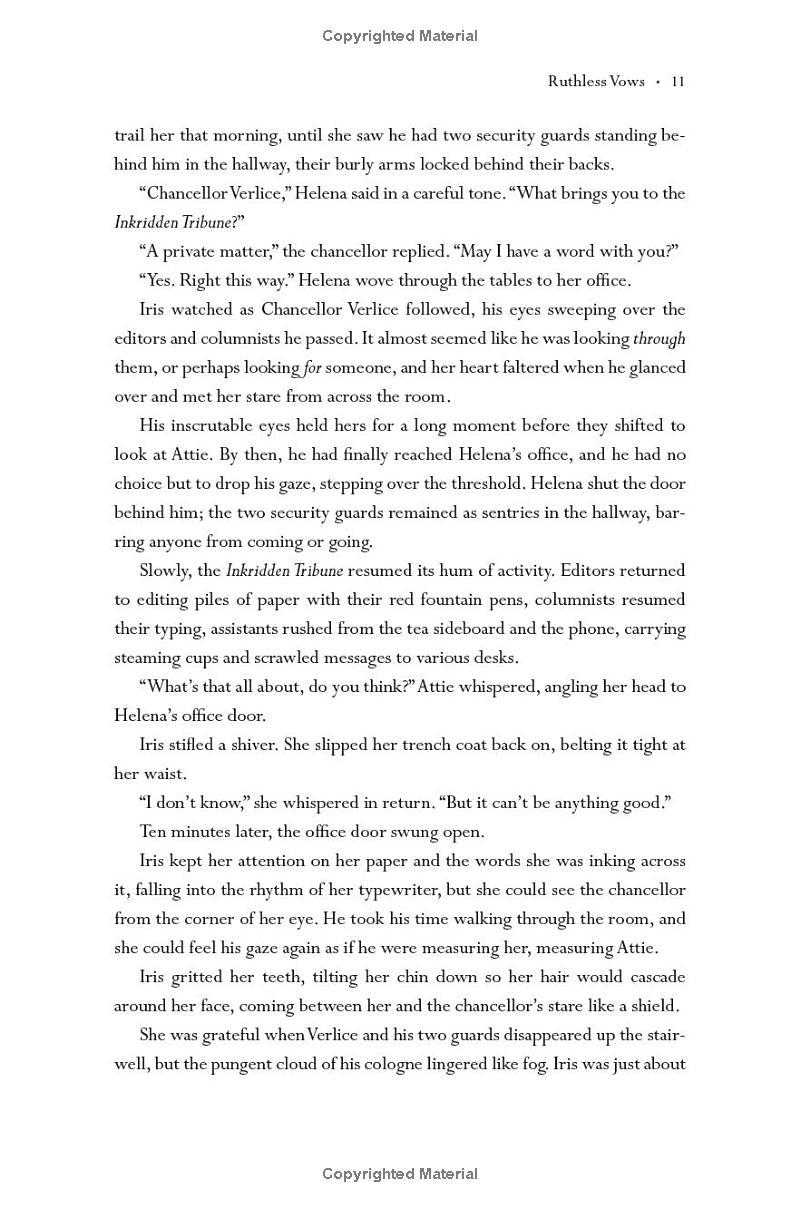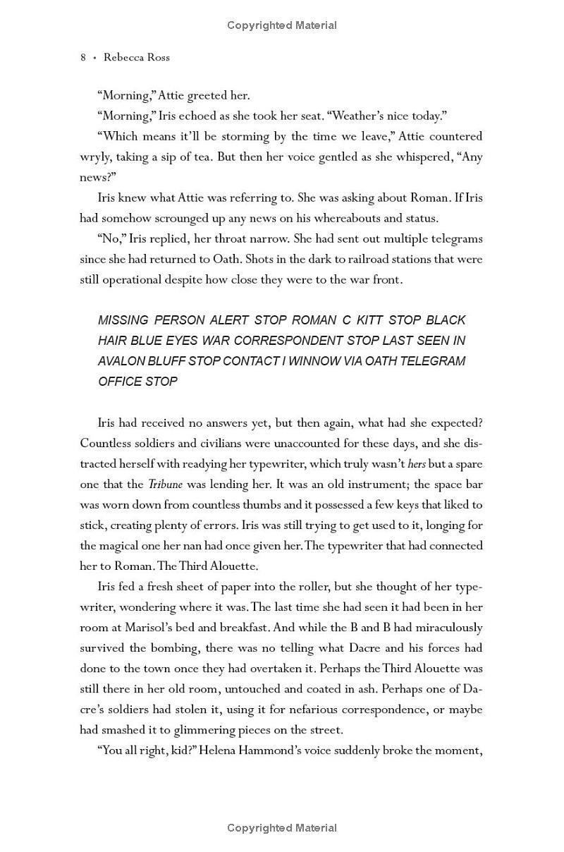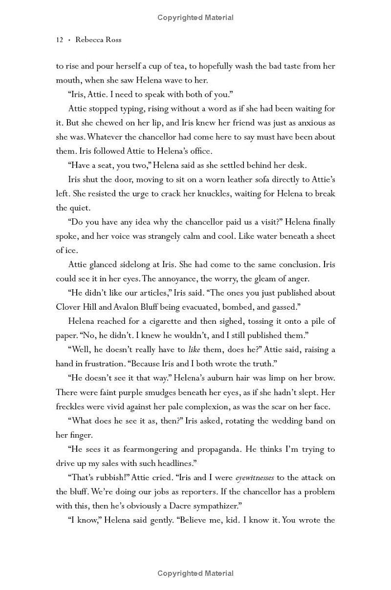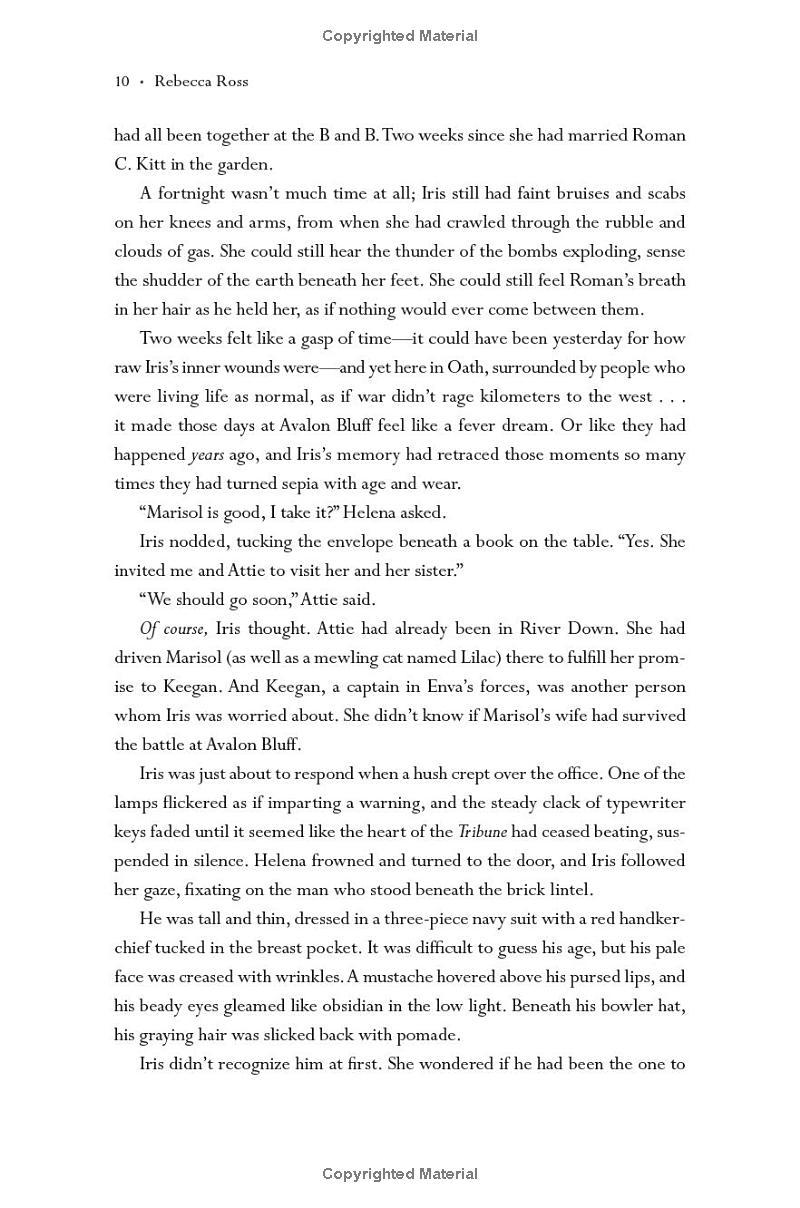 Two weeks have passed since Iris Winnow returned home bruised and heartbroken from the front, but the war is far from over. Roman is missing, and the city of Oath continues to dwell in a state of disbelief and ignorance. When Iris and Attie are given another chance to report on Dacre’s movements, they both take the opportunity and head westward once more despite the danger, knowing it’s only a matter of time before the conflict reaches a city that’s unprepared and fracturing beneath the chancellor’s reign.